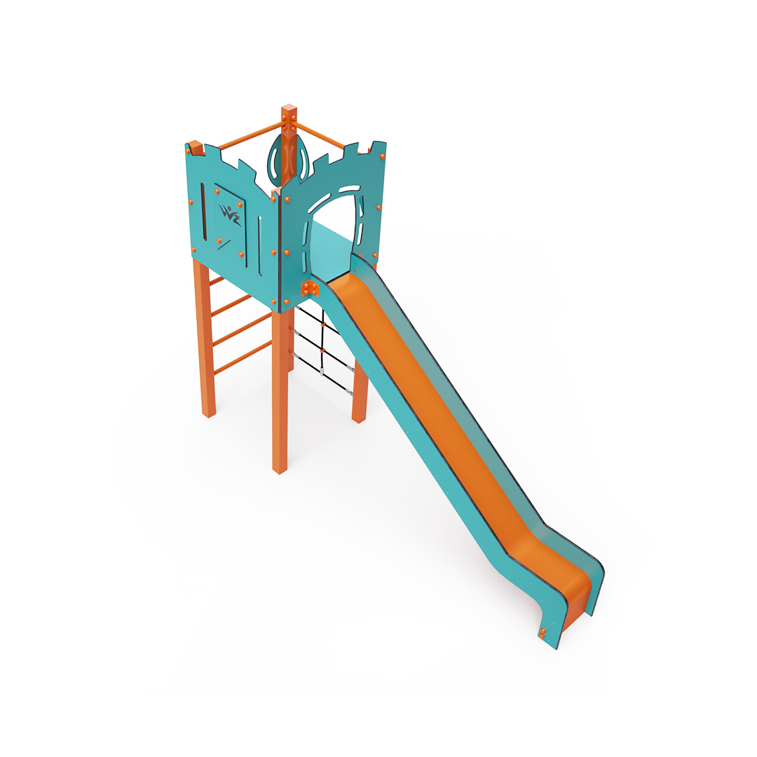 Az egytornyú játszóvár tartó szerkezete horganyzott és porszórt acélból, padlója és a mellvédek HPL jelölésű magas nyomású laminált kompaktlemezből, kötélrendszere acélmagos poliészter kötélből, csúszdája pedig HDPE műanyag és HPL kompaktlemez kombinációjából készül. A magas nyomású HPL lemez törhetetlen, nem mérgező, újrahasznosítható, továbbá vegyszer- és UV álló. A poliészter szálakból készült acélmagos kötél magas szilárdsággal bír és ezáltal jobban ellenáll a mechanikai igénybevételnek. Maga a poliészter számos pozitív tulajdonsággal rendelkezik. Színtartó, ellenáll a mikroorganizmusoknak, az időjárási hatásoknak, (pl. eső után gyorsan szárad). A HDPE jelölésű, nagy sűrűségű polietilén lapokat főként magas szilárdságuk, szívósságuk és nedvességállóságuk jellemzik. Minden kötőelem rozsdamentes acélból készül és a fokozott tartósság és biztonság érdekében műanyag kupakkal van lezárva. A használt anyagoknak köszönhetően az eszköz minimális karbantartást igényel! A játékeszközt úgy terveztük, hogy a hosszú élettartam mellett a maximális biztonságot is garantálja!