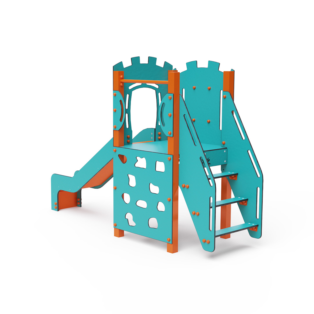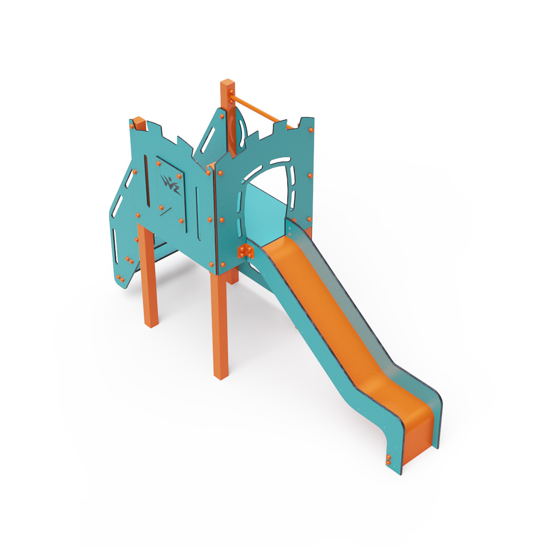 Az egytornyú játszóvár tartó szerkezete horganyzott és porszórt acélból, padlója, függőleges mászófala, lépcsője és a mellvédek HPL jelölésű magas nyomású laminált kompaktlemezből, csúszdája pedig HDPE műanyag és HPL kompaktlemez kombinációjából készül. A magas nyomású HPL lemez törhetetlen, nem mérgező, újrahasznosítható, továbbá vegyszer- és UV álló. A HDPE jelölésű, nagy sűrűségű polietilén lapokat főként magas szilárdságuk, szívósságuk és nedvességállóságuk jellemzik. Minden kötőelem rozsdamentes acélból készül és a fokozott tartósság és biztonság érdekében műanyag kupakkal van lezárva. A használt anyagoknak köszönhetően az eszköz minimális karbantartást igényel! A játékeszközt úgy terveztük, hogy a hosszú élettartam mellett a maximális biztonságot is garantálja!