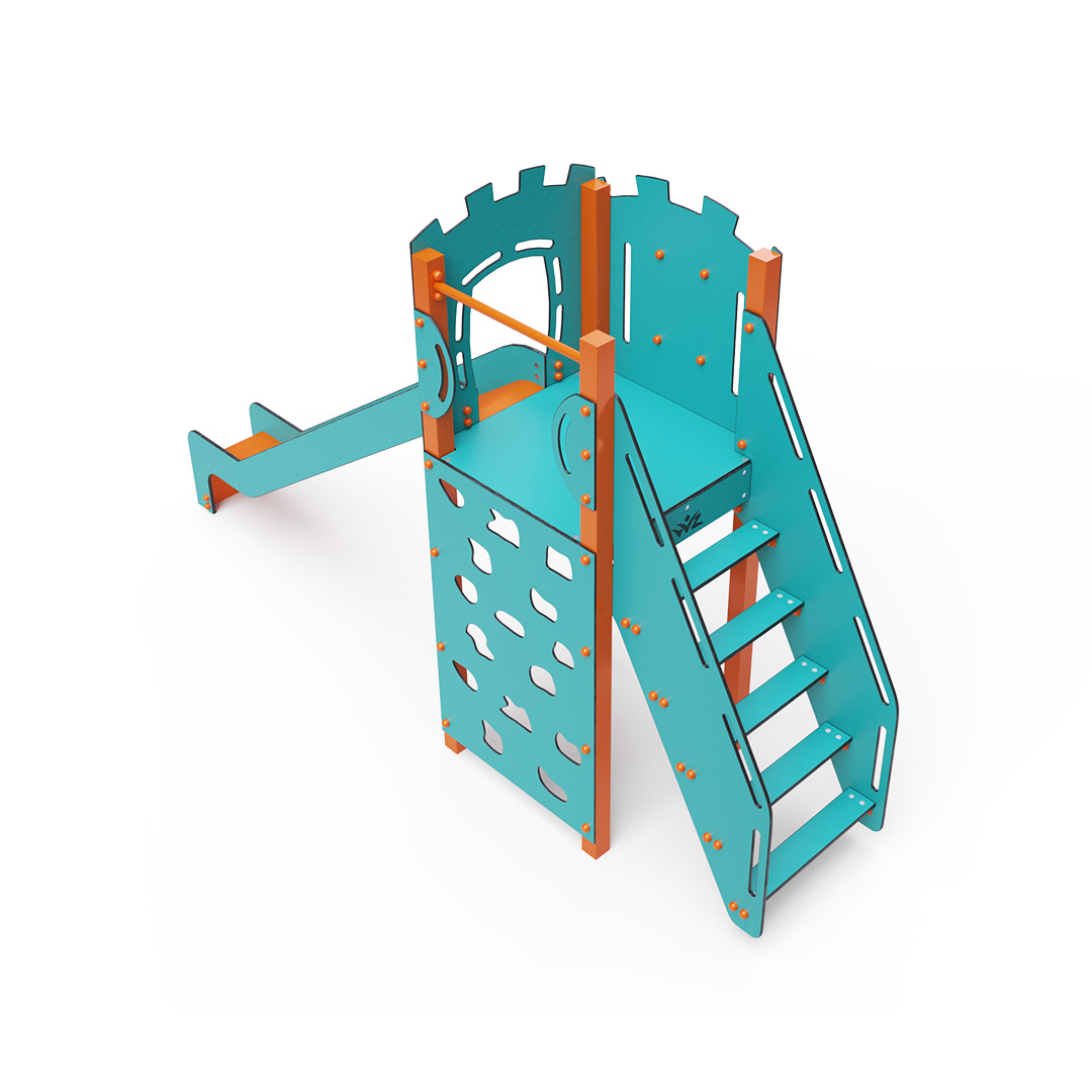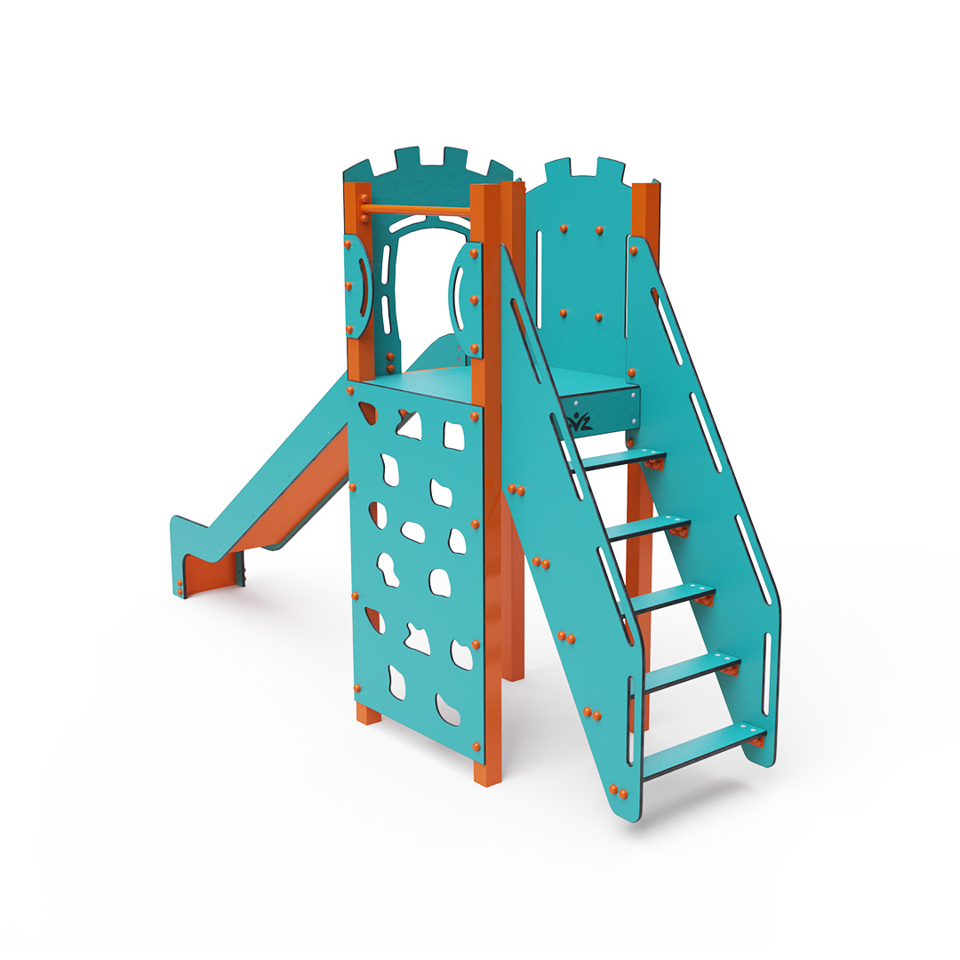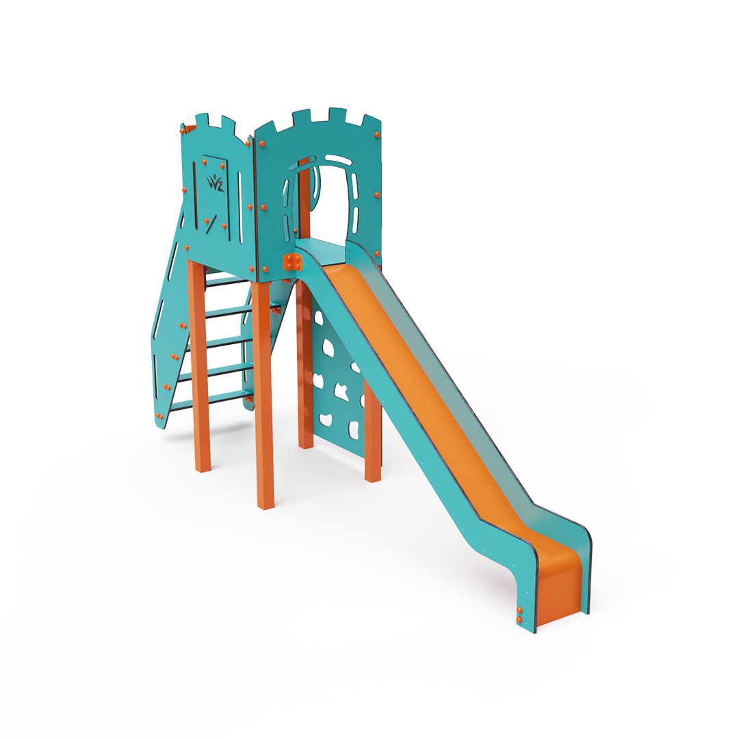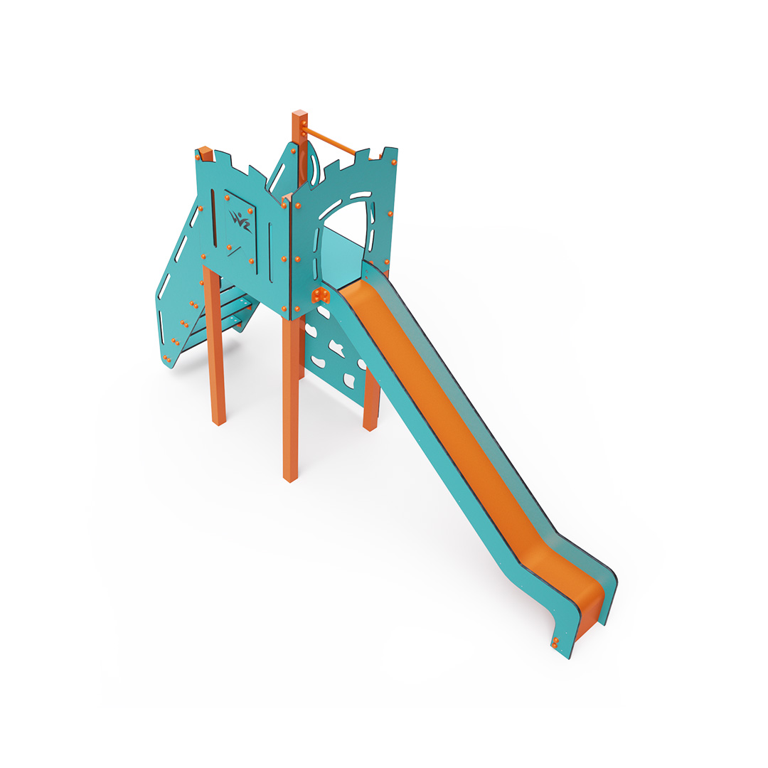 Az egytornyú játszóvár tartó szerkezete horganyzott és porszórt acélból, padlója, függőleges mászófala, lépcsője és a mellvédek HPL jelölésű magas nyomású laminált kompaktlemezből, csúszdája pedig HDPE műanyag és HPL kompaktlemez kombinációjából készül. A magas nyomású HPL lemez törhetetlen, nem mérgező, újrahasznosítható, továbbá vegyszer- és UV álló. A HDPE jelölésű, nagy sűrűségű polietilén lapokat főként magas szilárdságuk, szívósságuk és nedvességállóságuk jellemzik. Minden kötőelem rozsdamentes acélból készül és a fokozott tartósság és biztonság érdekében műanyag kupakkal van lezárva. A használt anyagoknak köszönhetően az eszköz minimális karbantartást igényel! A játékeszközt úgy terveztük, hogy a hosszú élettartam mellett a maximális biztonságot is garantálja!