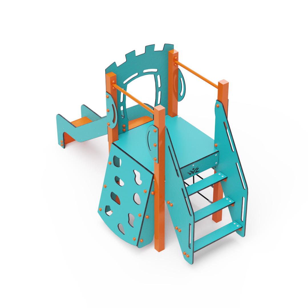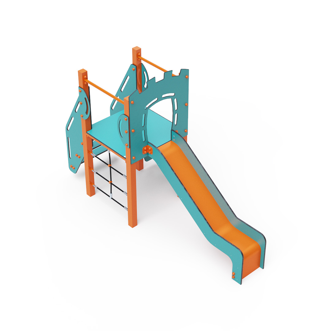 Az egytornyú játszóvár tartó szerkezete horganyzott és porszórt acélból, padlója, ferde mászófala, lépcsője és a mellvédek HPL jelölésű magas nyomású laminált kompaktlemezből, kötélrendszere acélmagos poliészter kötélből, csúszdája pedig HDPE műanyag és HPL kompaktlemez kombinációjából készül. A magas nyomású HPL lemez törhetetlen, nem mérgező, újrahasznosítható, továbbá vegyszer- és UV álló. A poliészter szálakból készült acélmagos kötél magas szilárdsággal bír és ezáltal jobban ellenáll a mechanikai igénybevételnek. Maga a poliészter számos pozitív tulajdonsággal rendelkezik. Színtartó, ellenáll a mikroorganizmusoknak, az időjárási hatásoknak, (pl. eső után gyorsan szárad). A HDPE jelölésű, nagy sűrűségű polietilén lapokat főként magas szilárdságuk, szívósságuk és nedvességállóságuk jellemzik. Minden kötőelem rozsdamentes acélból készül és a fokozott tartósság és biztonság érdekében műanyag kupakkal van lezárva. A használt anyagoknak köszönhetően az eszköz minimális karbantartást igényel! A játékeszközt úgy terveztük, hogy a hosszú élettartam mellett a maximális biztonságot is garantálja!