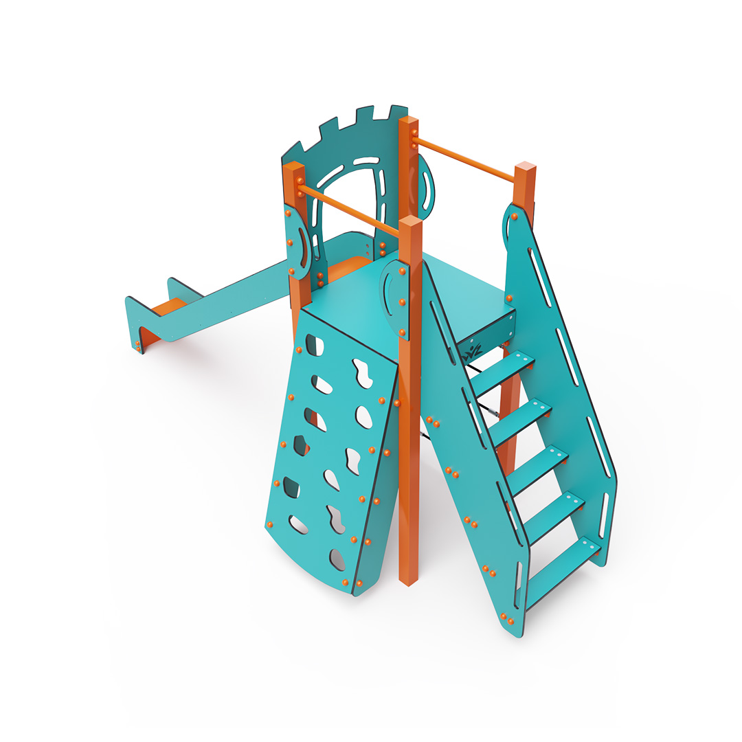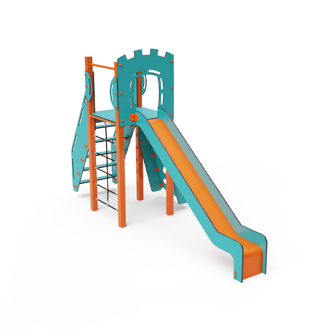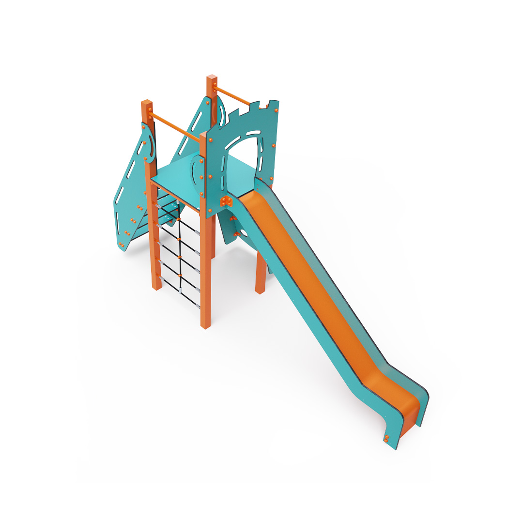 Az egytornyú játszóvár tartó szerkezete horganyzott és porszórt acélból, padlója, ferde mászófala, lépcsője és a mellvédek HPL jelölésű magas nyomású laminált kompaktlemezből, kötélrendszere acélmagos poliészter kötélből, csúszdája pedig HDPE műanyag és HPL kompaktlemez kombinációjából készül. A magas nyomású HPL lemez törhetetlen, nem mérgező, újrahasznosítható, továbbá vegyszer- és UV álló. A poliészter szálakból készült acélmagos kötél magas szilárdsággal bír és ezáltal jobban ellenáll a mechanikai igénybevételnek. Maga a poliészter számos pozitív tulajdonsággal rendelkezik. Színtartó, ellenáll a mikroorganizmusoknak, az időjárási hatásoknak, (pl. eső után gyorsan szárad). A HDPE jelölésű, nagy sűrűségű polietilén lapokat főként magas szilárdságuk, szívósságuk és nedvességállóságuk jellemzik. Minden kötőelem rozsdamentes acélból készül és a fokozott tartósság és biztonság érdekében műanyag kupakkal van lezárva. A használt anyagoknak köszönhetően az eszköz minimális karbantartást igényel! A játékeszközt úgy terveztük, hogy a hosszú élettartam mellett a maximális biztonságot is garantálja!
