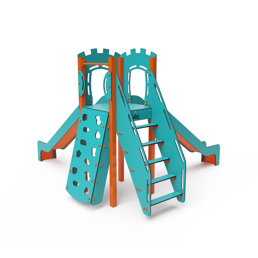 - lépcső, ferde mászófal, 2× csúszda