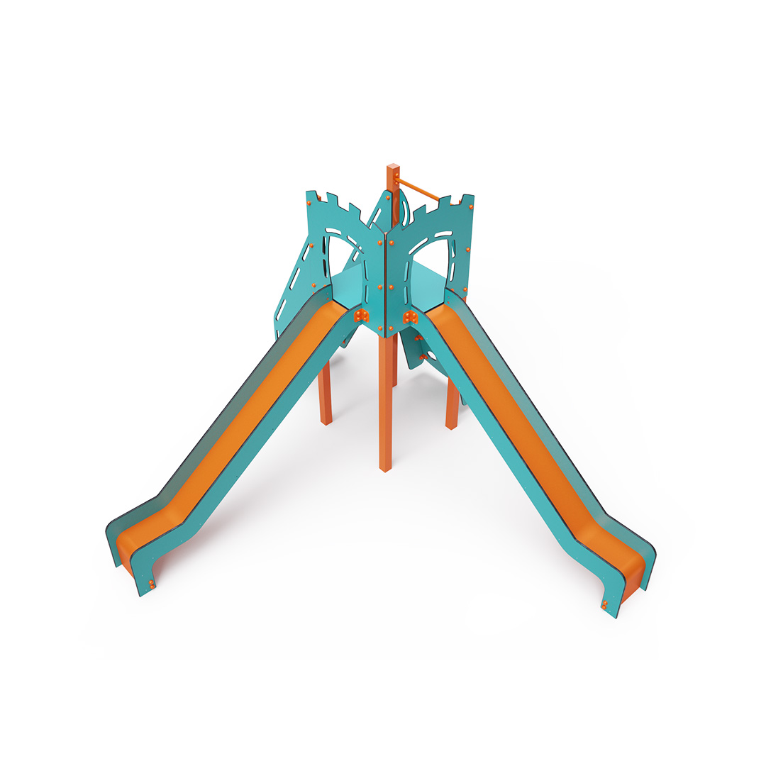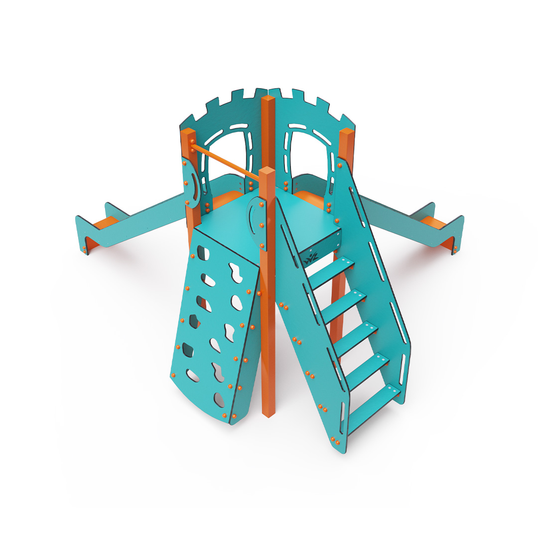 Az egytornyú játszóvár tartó szerkezete horganyzott és porszórt acélból, padlója, ferde mászófala, lépcsője és a mellvédek HPL jelölésű magas nyomású laminált kompaktlemezből, csúszdái pedig HDPE műanyag és HPL kompaktlemez kombinációjából készülnek. A magas nyomású HPL lemez törhetetlen, nem mérgező, újrahasznosítható, továbbá vegyszer- és UV álló. A HDPE jelölésű, nagy sűrűségű polietilén lapokat főként magas szilárdságuk, szívósságuk és nedvességállóságuk jellemzik. Minden kötőelem rozsdamentes acélból készül és a fokozott tartósság és biztonság érdekében műanyag kupakkal van lezárva. A használt anyagoknak köszönhetően az eszköz minimális karbantartást igényel! A játékeszközt úgy terveztük, hogy a hosszú élettartam mellett a maximális biztonságot is garantálja!