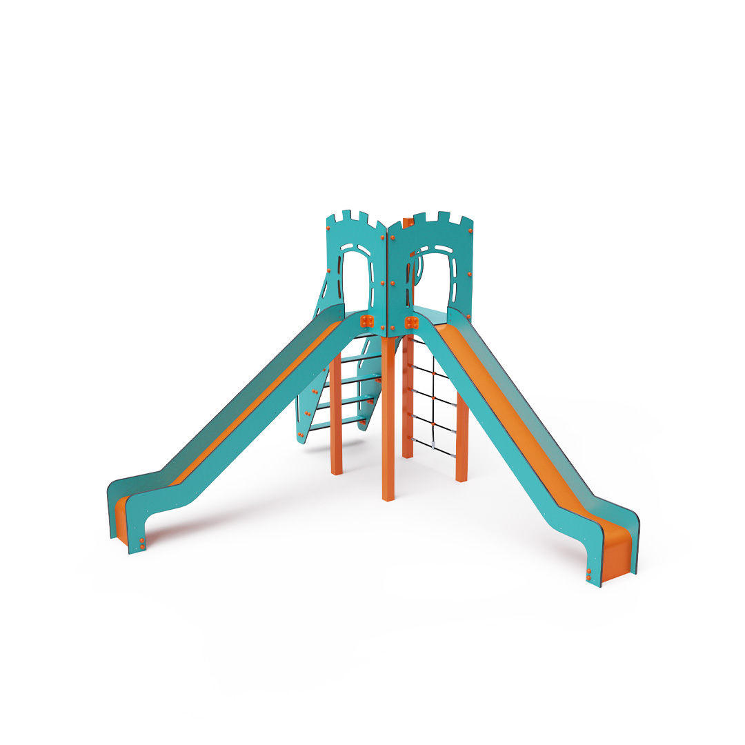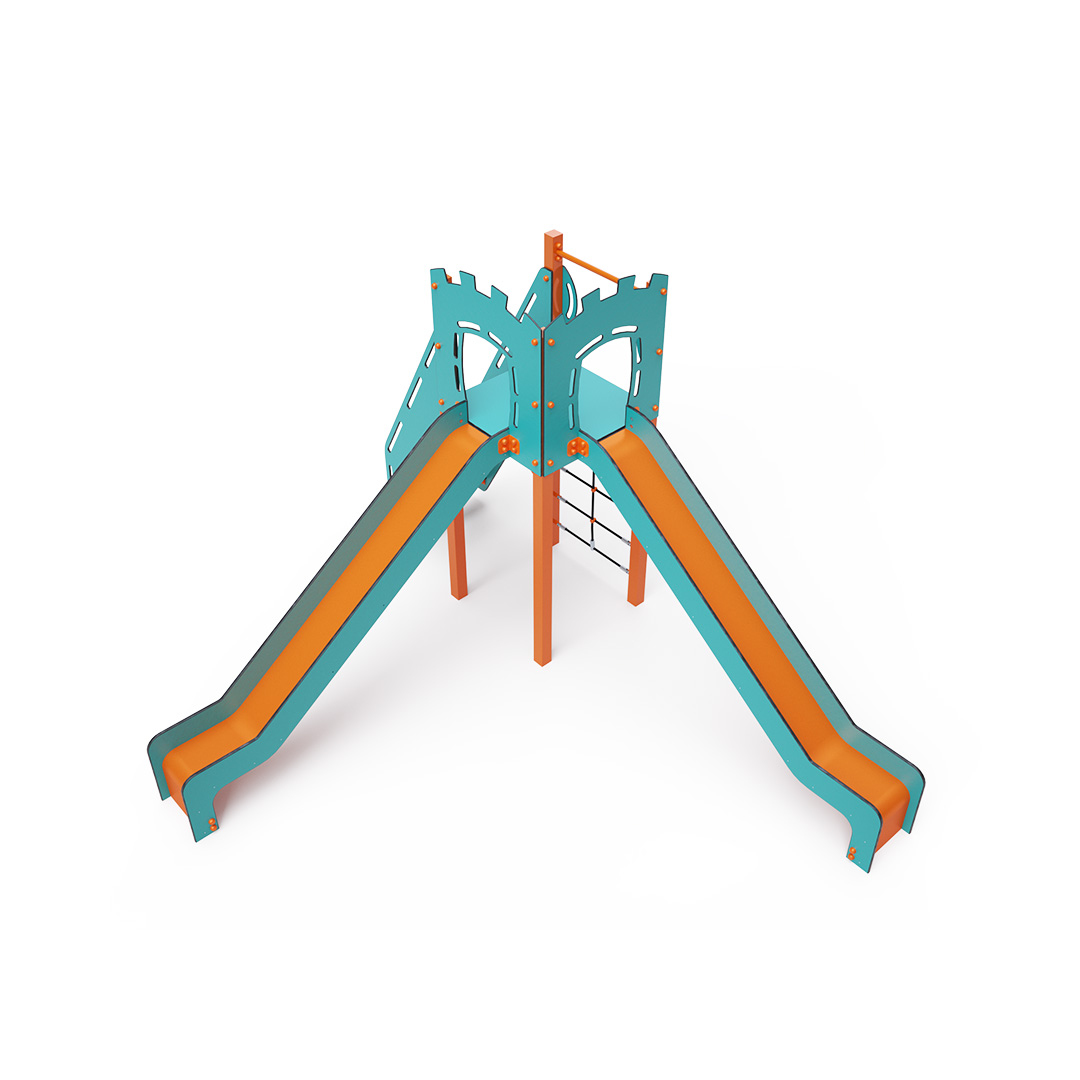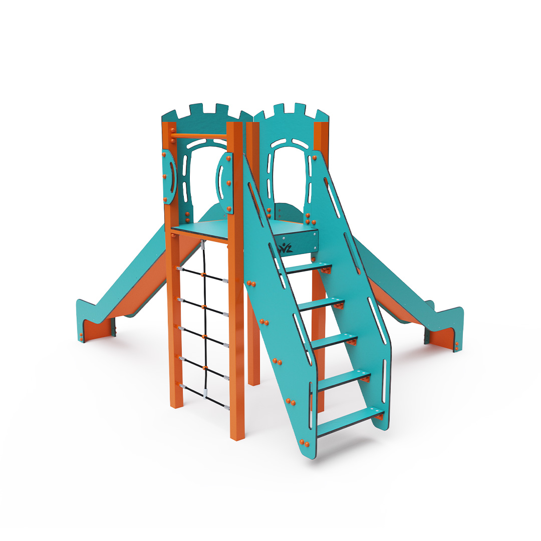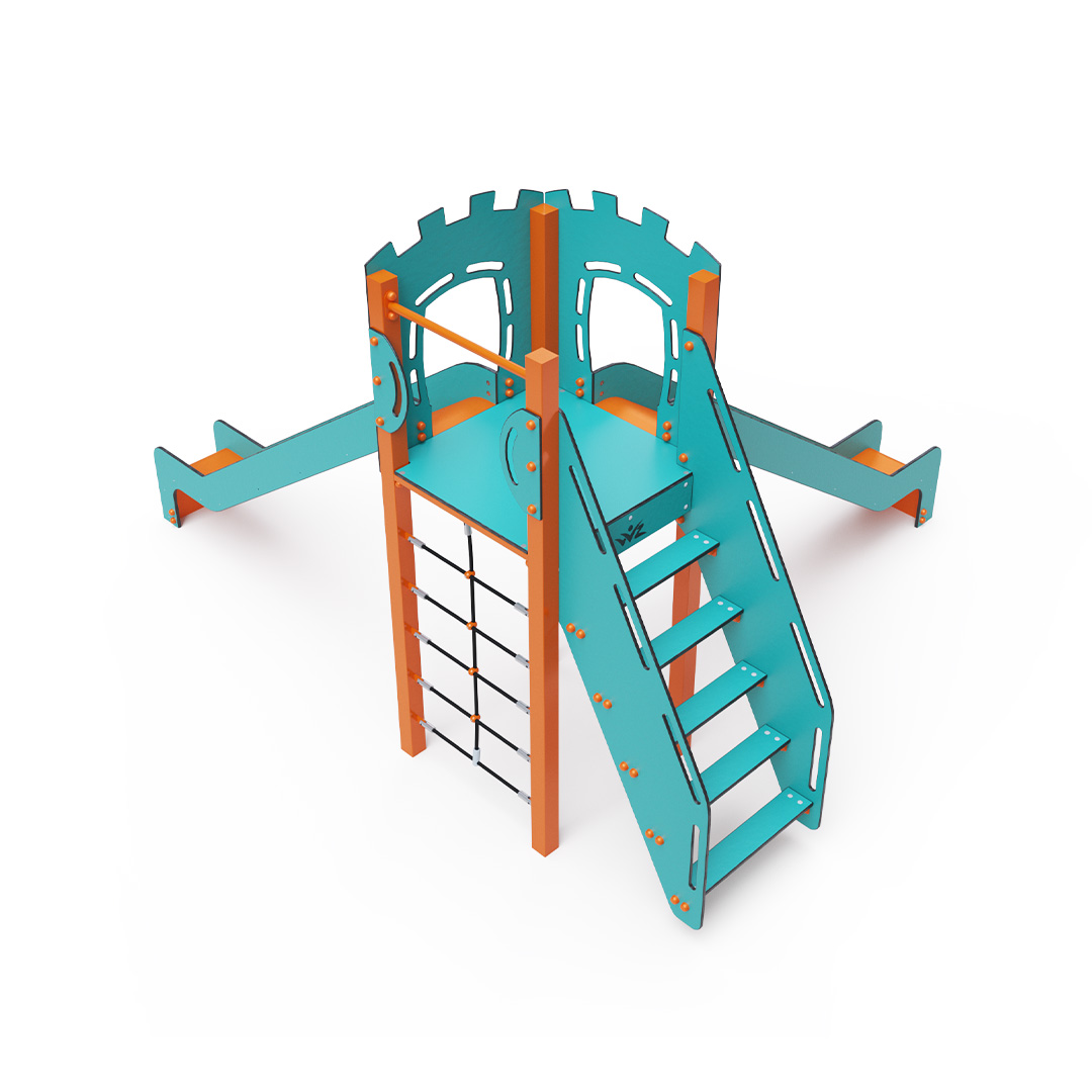 Az egytornyú játszóvár tartó szerkezete horganyzott és porszórt acélból, padlója, lépcsője és a mellvédek HPL jelölésű magas nyomású laminált kompaktlemezből, kötélrendszere acélmagos poliészter kötélből, csúszdái pedig HDPE műanyag és HPL kompaktlemez kombinációjából készülnek. A magas nyomású HPL lemez törhetetlen, nem mérgező, újrahasznosítható, továbbá vegyszer- és UV álló. A poliészter szálakból készült acélmagos kötél magas szilárdsággal bír és ezáltal jobban ellenáll a mechanikai igénybevételnek. Maga a poliészter számos pozitív tulajdonsággal rendelkezik. Színtartó, ellenáll a mikroorganizmusoknak, az időjárási hatásoknak, (pl. eső után gyorsan szárad). A HDPE jelölésű, nagy sűrűségű polietilén lapokat főként magas szilárdságuk, szívósságuk és nedvességállóságuk jellemzik. Minden kötőelem rozsdamentes acélból készül és a fokozott tartósság és biztonság érdekében műanyag kupakkal van lezárva. A használt anyagoknak köszönhetően az eszköz minimális karbantartást igényel! A játékeszközt úgy terveztük, hogy a hosszú élettartam mellett a maximális biztonságot is garantálja!