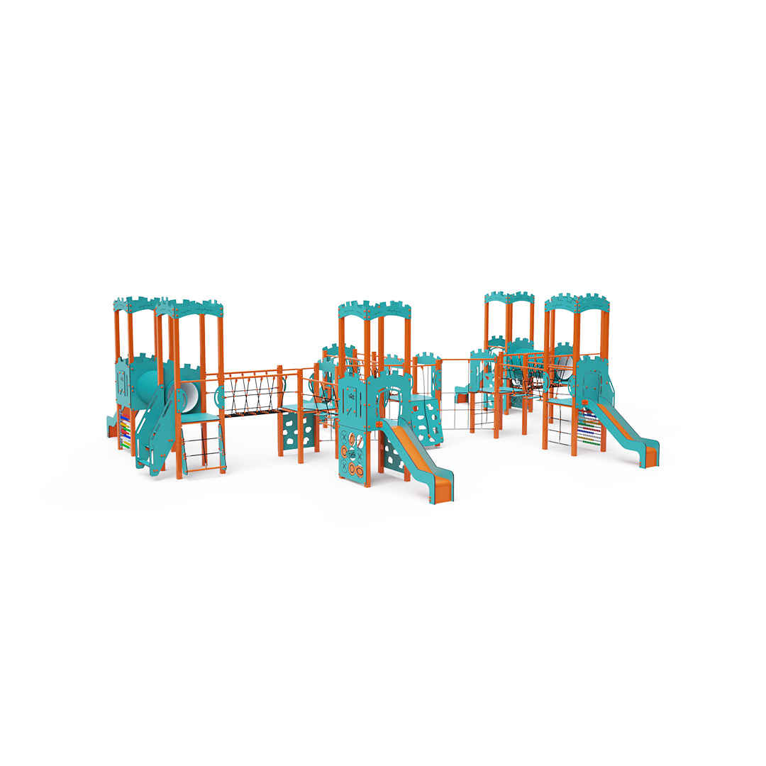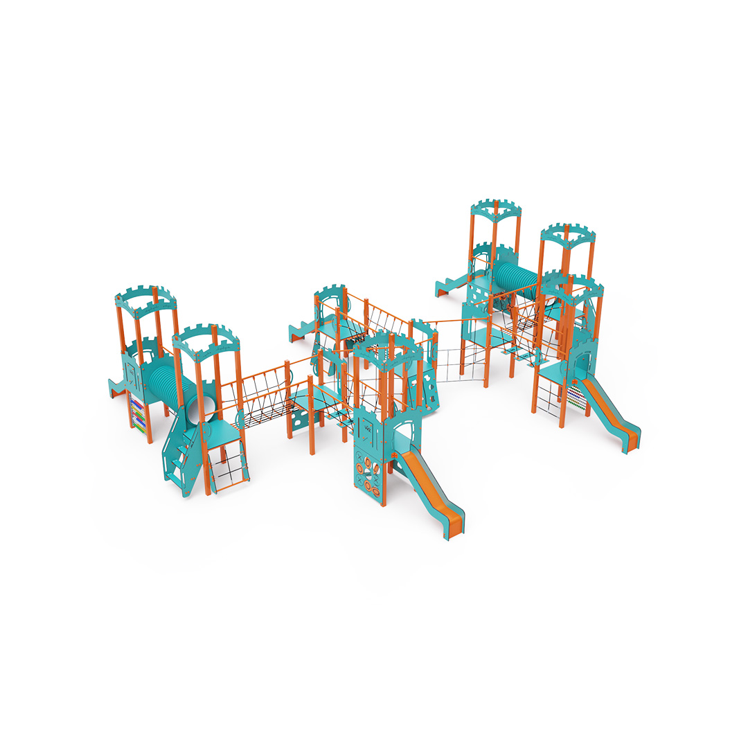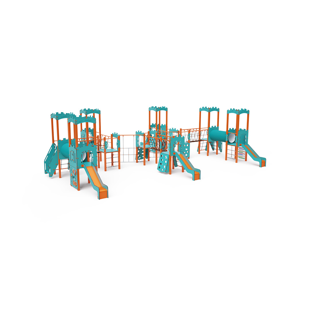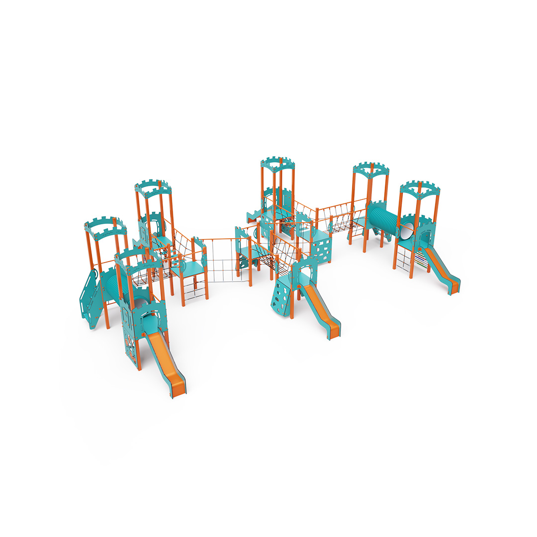 A tíztornyú játszóvár tartó szerkezete horganyzott és porszórt acélból, padlói, mászófalai, lépcsői, koronái és a mellvédek HPL jelölésű magas nyomású laminált kompaktlemezből, alagútrendszere UV álló PVC-U csőből, kötélrendszere acélmagos poliészter kötélből, csúszdái pedig HDPE műanyag és HPL kompaktlemez kombinációjából készülnek. A magas nyomású HPL lemez törhetetlen, nem mérgező, újrahasznosítható, továbbá vegyszer- és UV álló. A poliészter szálakból készült acélmagos kötél magas szilárdsággal bír és ezáltal jobban ellenáll a mechanikai igénybevételnek. Maga a poliészter számos pozitív tulajdonsággal rendelkezik. Színtartó, ellenáll a mikroorganizmusoknak, az időjárási hatásoknak, (pl. eső után gyorsan szárad). A HDPE jelölésű, nagy sűrűségű polietilén lapokat főként magas szilárdságuk, szívósságuk és nedvességállóságuk jellemzik. Minden kötőelem rozsdamentes acélból készül és a fokozott tartósság és biztonság érdekében műanyag kupakkal van lezárva. A használt anyagoknak köszönhetően az eszköz minimális karbantartást igényel! A játékeszközt úgy terveztük, hogy a hosszú élettartam mellett a maximális biztonságot is garantálja!