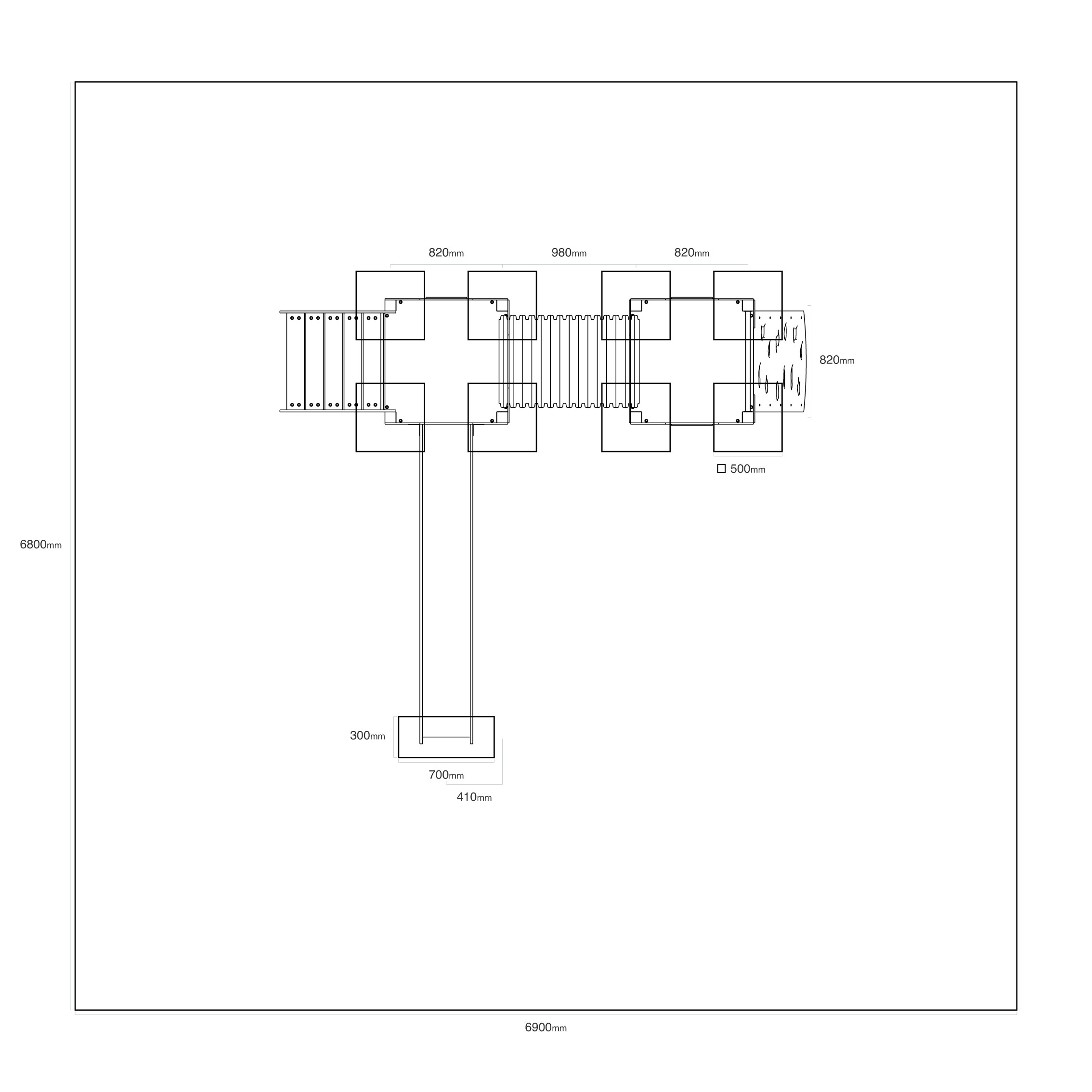 - Biztonsági zóna: 6,9 × 6,8 m