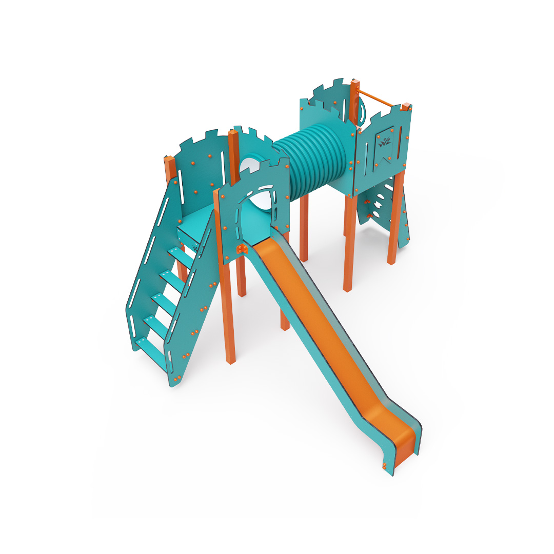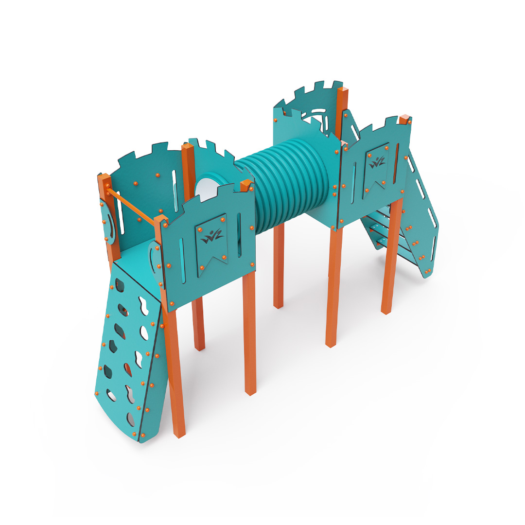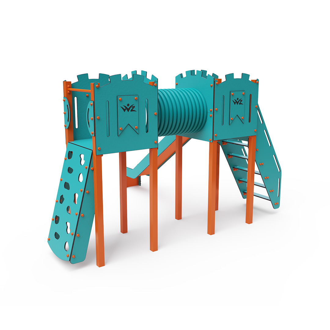 A kéttornyú játszóvár tartó szerkezete horganyzott és porszórt acélból, padlói, ferde mászófala, lépcsője és a mellvédek HPL jelölésű magas nyomású laminált kompaktlemezből, alagútrendszere UV álló PVC-U csőből, csúszdája pedig HDPE műanyag és HPL kompaktlemez kombinációjából készül. A magas nyomású HPL lemez törhetetlen, nem mérgező, újrahasznosítható, továbbá vegyszer- és UV álló. A HDPE jelölésű, nagy sűrűségű polietilén lapokat főként magas szilárdságuk, szívósságuk és nedvességállóságuk jellemzik. Minden kötőelem rozsdamentes acélból készül és a fokozott tartósság és biztonság érdekében műanyag kupakkal van lezárva. A használt anyagoknak köszönhetően az eszköz minimális karbantartást igényel! A játékeszközt úgy terveztük, hogy a hosszú élettartam mellett a maximális biztonságot is garantálja!