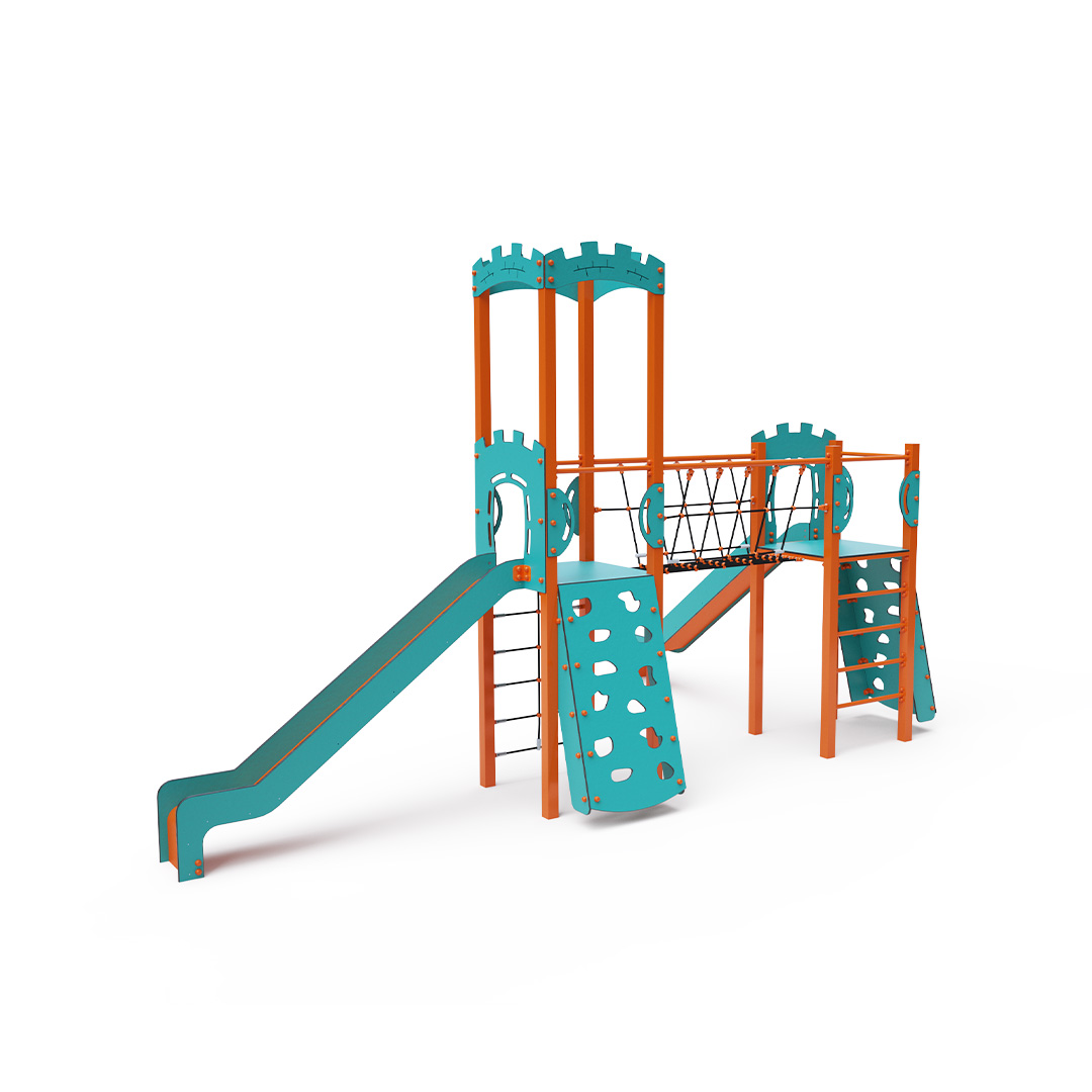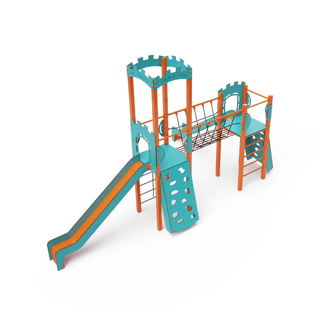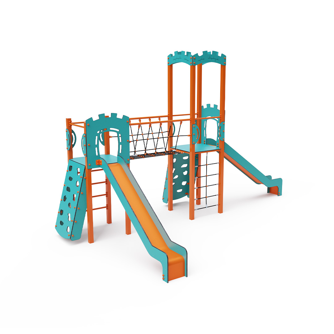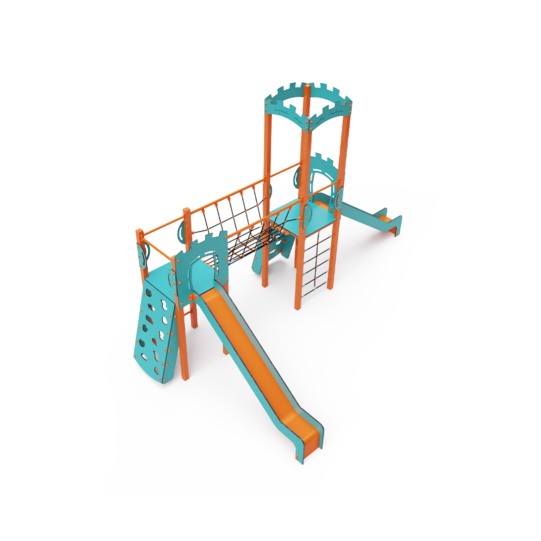 A kéttornyú játszóvár tartó szerkezete horganyzott és porszórt acélból, padlói, ferde mászófalai, koronája és a mellvédek HPL jelölésű magas nyomású laminált kompaktlemezből, kötélrendszere acélmagos poliészter kötélből, csúszdái pedig HDPE műanyag és HPL kompaktlemez kombinációjából készülnek. A magas nyomású HPL lemez törhetetlen, nem mérgező, újrahasznosítható, továbbá vegyszer- és UV álló. A poliészter szálakból készült acélmagos kötél magas szilárdsággal bír és ezáltal jobban ellenáll a mechanikai igénybevételnek. Maga a poliészter számos pozitív tulajdonsággal rendelkezik. Színtartó, ellenáll a mikroorganizmusoknak, az időjárási hatásoknak, (pl. eső után gyorsan szárad). A HDPE jelölésű, nagy sűrűségű polietilén lapokat főként magas szilárdságuk, szívósságuk és nedvességállóságuk jellemzik. Minden kötőelem rozsdamentes acélból készül és a fokozott tartósság és biztonság érdekében műanyag kupakkal van lezárva. A használt anyagoknak köszönhetően az eszköz minimális karbantartást igényel! A játékeszközt úgy terveztük, hogy a hosszú élettartam mellett a maximális biztonságot is garantálja!