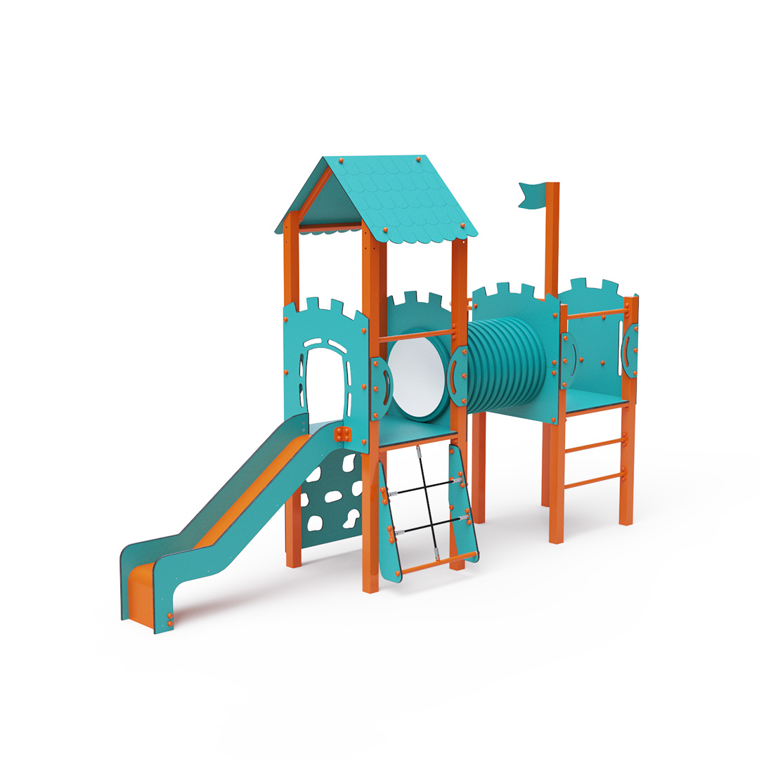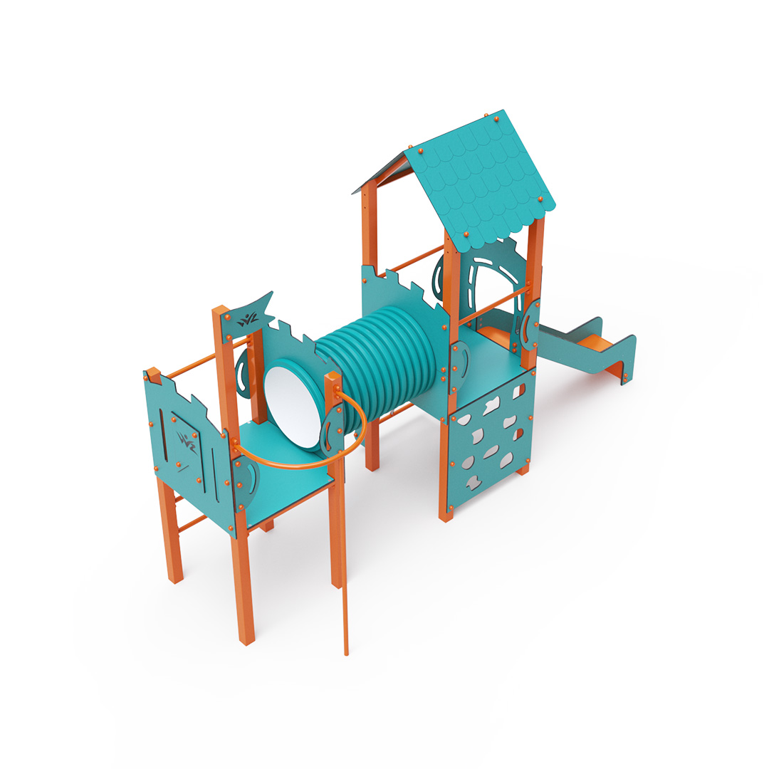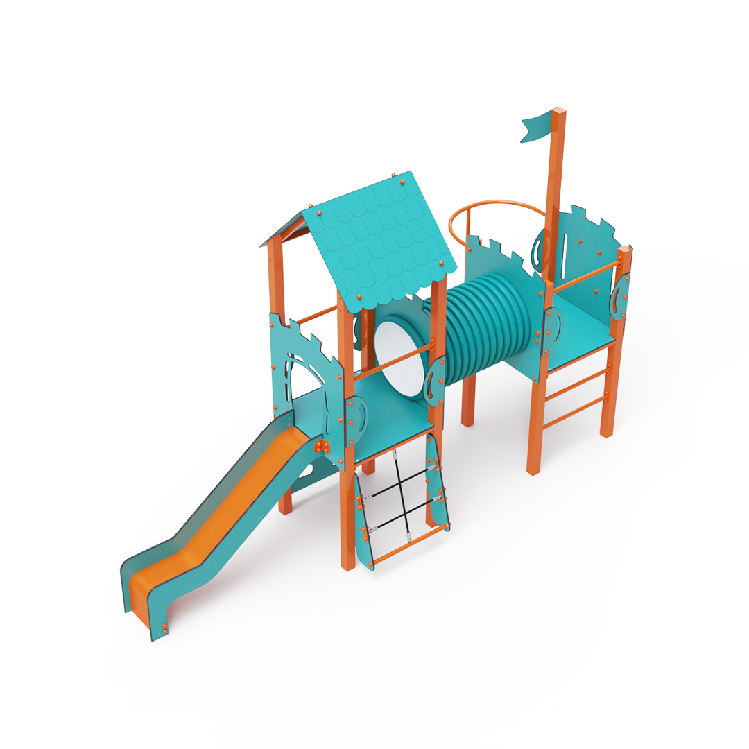 A kéttornyú játszóvár tartó szerkezete horganyzott és porszórt acélból, padlói, függőleges mászófala, zászlója, teteje és a mellvédek HPL jelölésű magas nyomású laminált kompaktlemezből, alagútrendszere UV álló PVC-U csőből, kötélrendszere acélmagos poliészter kötélből, csúszdája pedig HDPE műanyag és HPL kompaktlemez kombinációjából készül. A magas nyomású HPL lemez törhetetlen, nem mérgező, újrahasznosítható, továbbá vegyszer- és UV álló. A poliészter szálakból készült acélmagos kötél magas szilárdsággal bír és ezáltal jobban ellenáll a mechanikai igénybevételnek. Maga a poliészter számos pozitív tulajdonsággal rendelkezik. Színtartó, ellenáll a mikroorganizmusoknak, az időjárási hatásoknak, (pl. eső után gyorsan szárad). A HDPE jelölésű, nagy sűrűségű polietilén lapokat főként magas szilárdságuk, szívósságuk és nedvességállóságuk jellemzik. Minden kötőelem rozsdamentes acélból készül és a fokozott tartósság és biztonság érdekében műanyag kupakkal van lezárva. A használt anyagoknak köszönhetően az eszköz minimális karbantartást igényel! A játékeszközt úgy terveztük, hogy a hosszú élettartam mellett a maximális biztonságot is garantálja!
