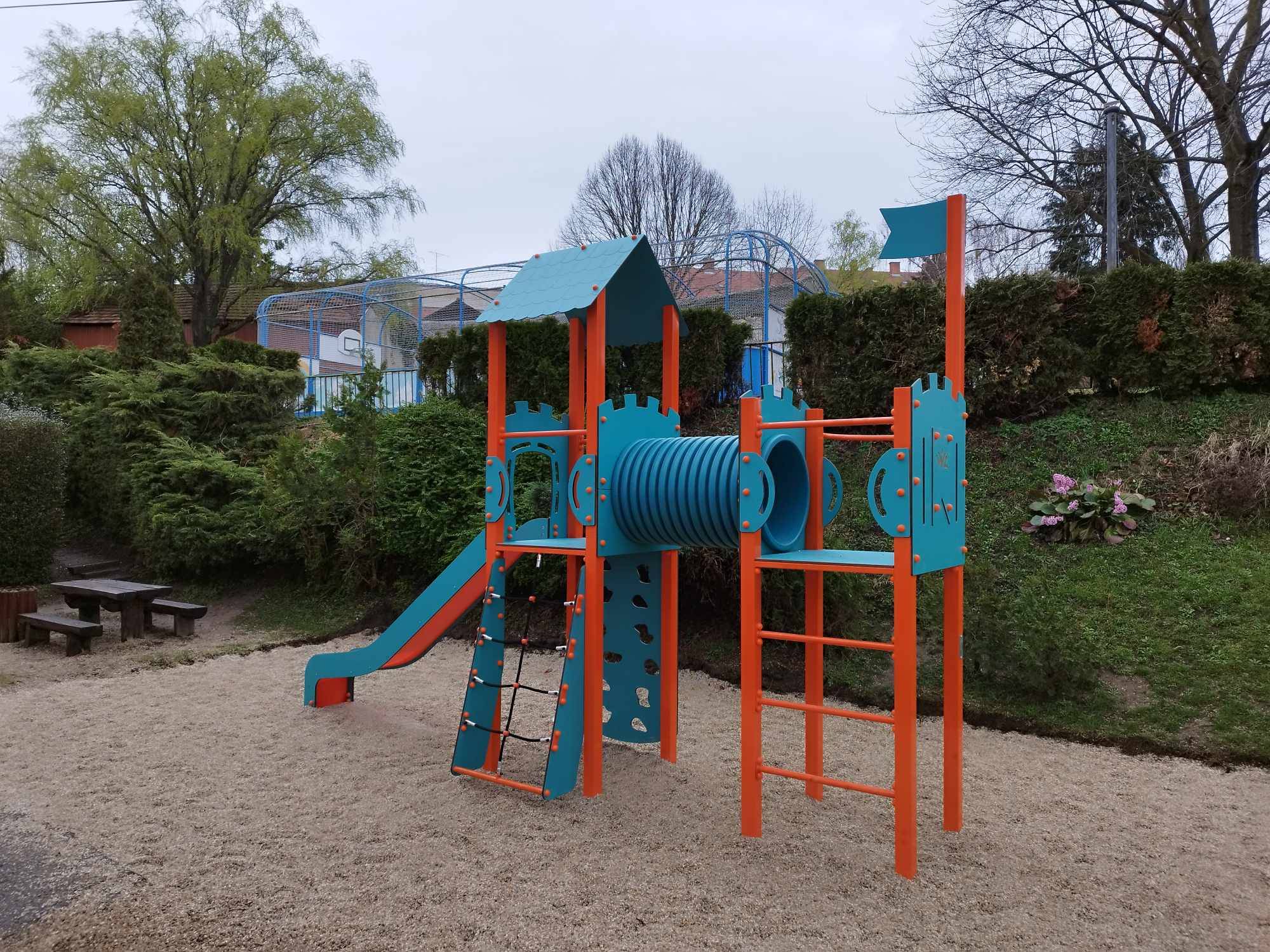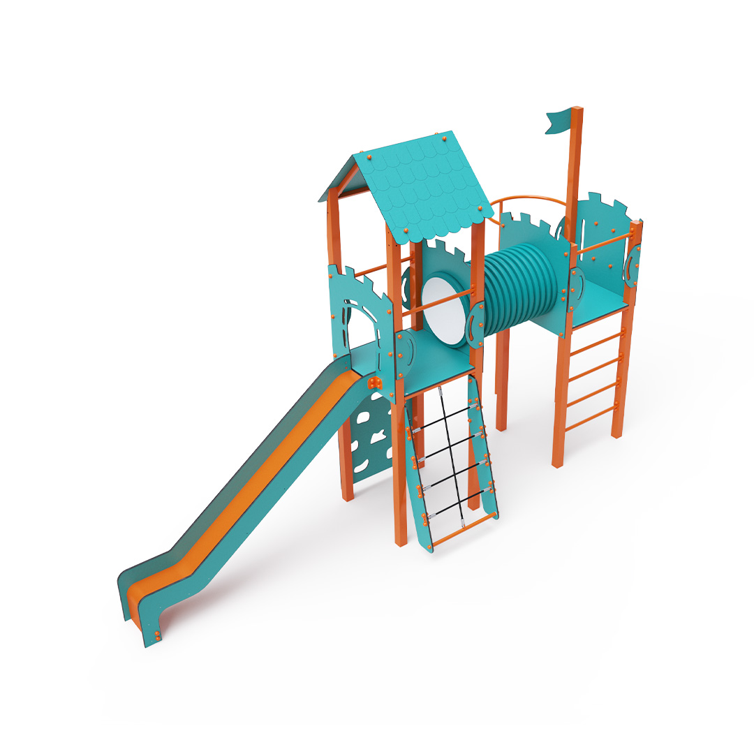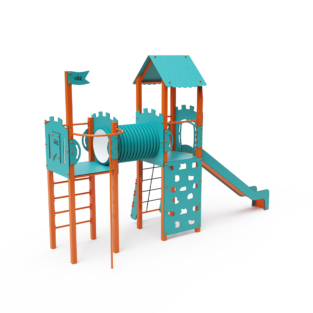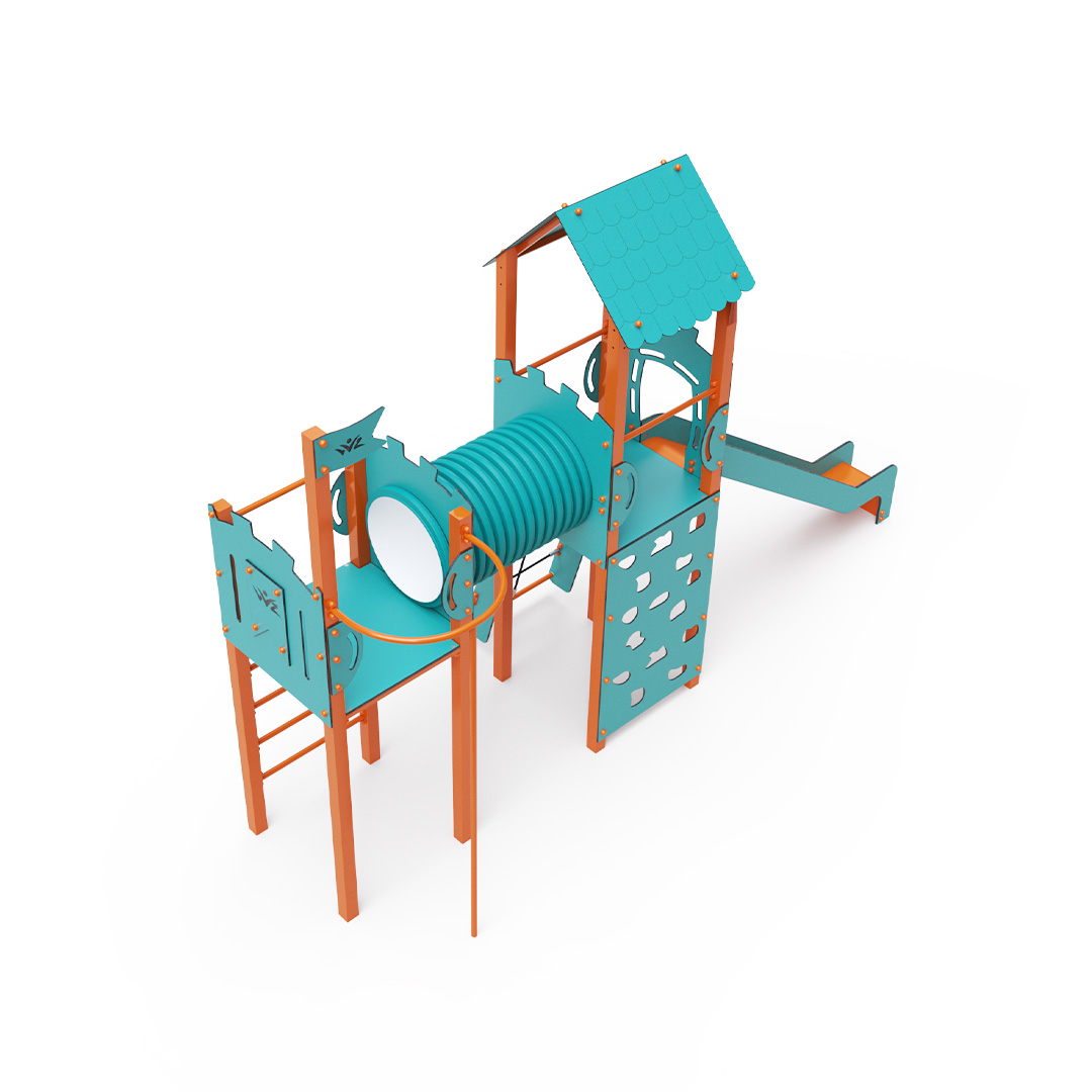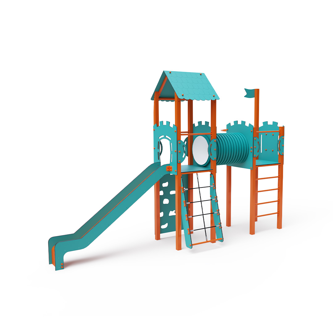 A kéttornyú játszóvár tartó szerkezete horganyzott és porszórt acélból, padlói, függőleges mászófala, zászlója, teteje és a mellvédek HPL jelölésű magas nyomású laminált kompaktlemezből, alagútrendszere UV álló PVC-U csőből, kötélrendszere acélmagos poliészter kötélből, csúszdája pedig HDPE műanyag és HPL kompaktlemez kombinációjából készül. A magas nyomású HPL lemez törhetetlen, nem mérgező, újrahasznosítható, továbbá vegyszer- és UV álló. A poliészter szálakból készült acélmagos kötél magas szilárdsággal bír és ezáltal jobban ellenáll a mechanikai igénybevételnek. Maga a poliészter számos pozitív tulajdonsággal rendelkezik. Színtartó, ellenáll a mikroorganizmusoknak, az időjárási hatásoknak, (pl. eső után gyorsan szárad). A HDPE jelölésű, nagy sűrűségű polietilén lapokat főként magas szilárdságuk, szívósságuk és nedvességállóságuk jellemzik. Minden kötőelem rozsdamentes acélból készül és a fokozott tartósság és biztonság érdekében műanyag kupakkal van lezárva. A használt anyagoknak köszönhetően az eszköz minimális karbantartást igényel! A játékeszközt úgy terveztük, hogy a hosszú élettartam mellett a maximális biztonságot is garantálja!