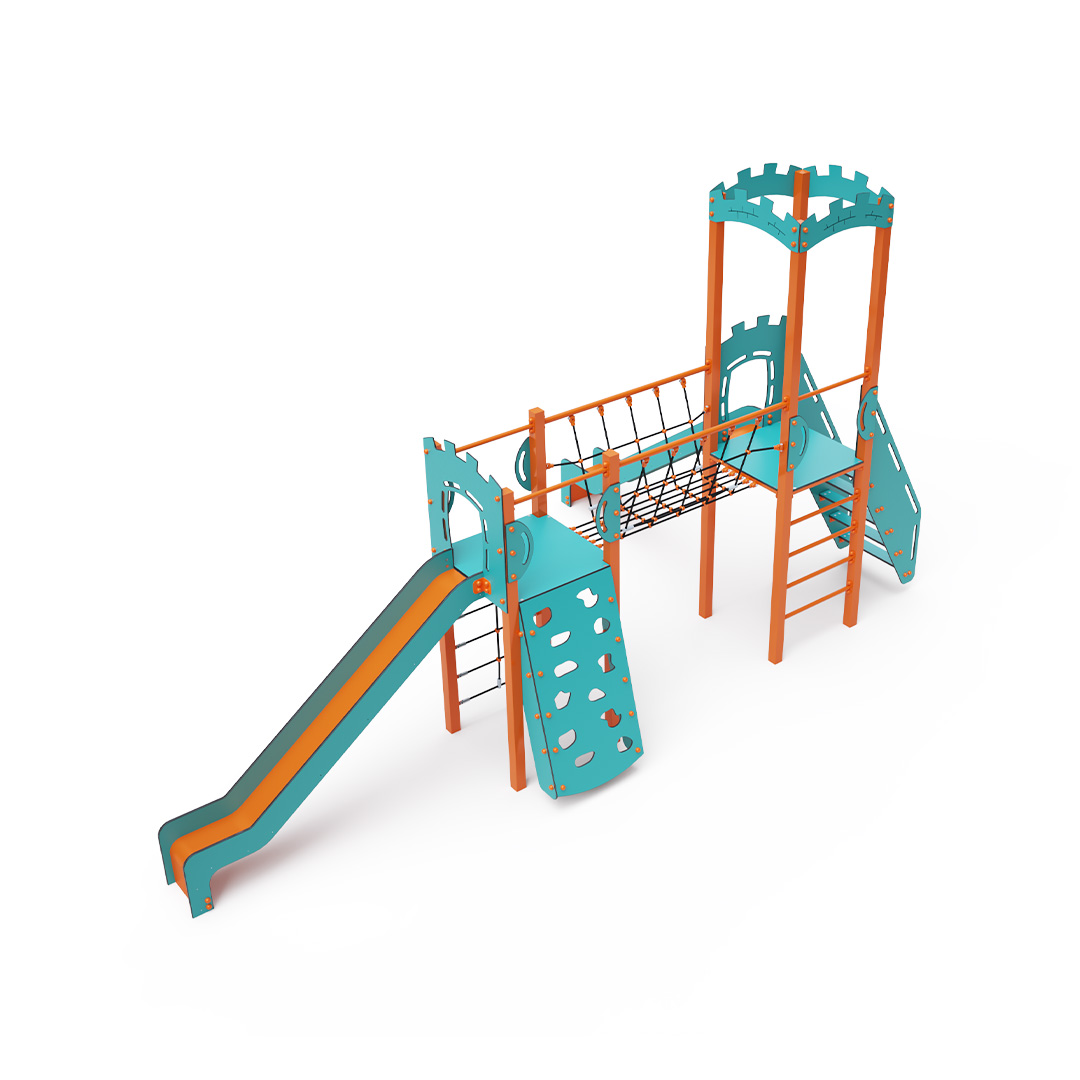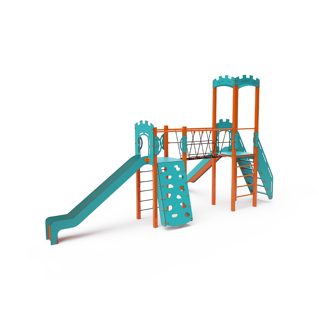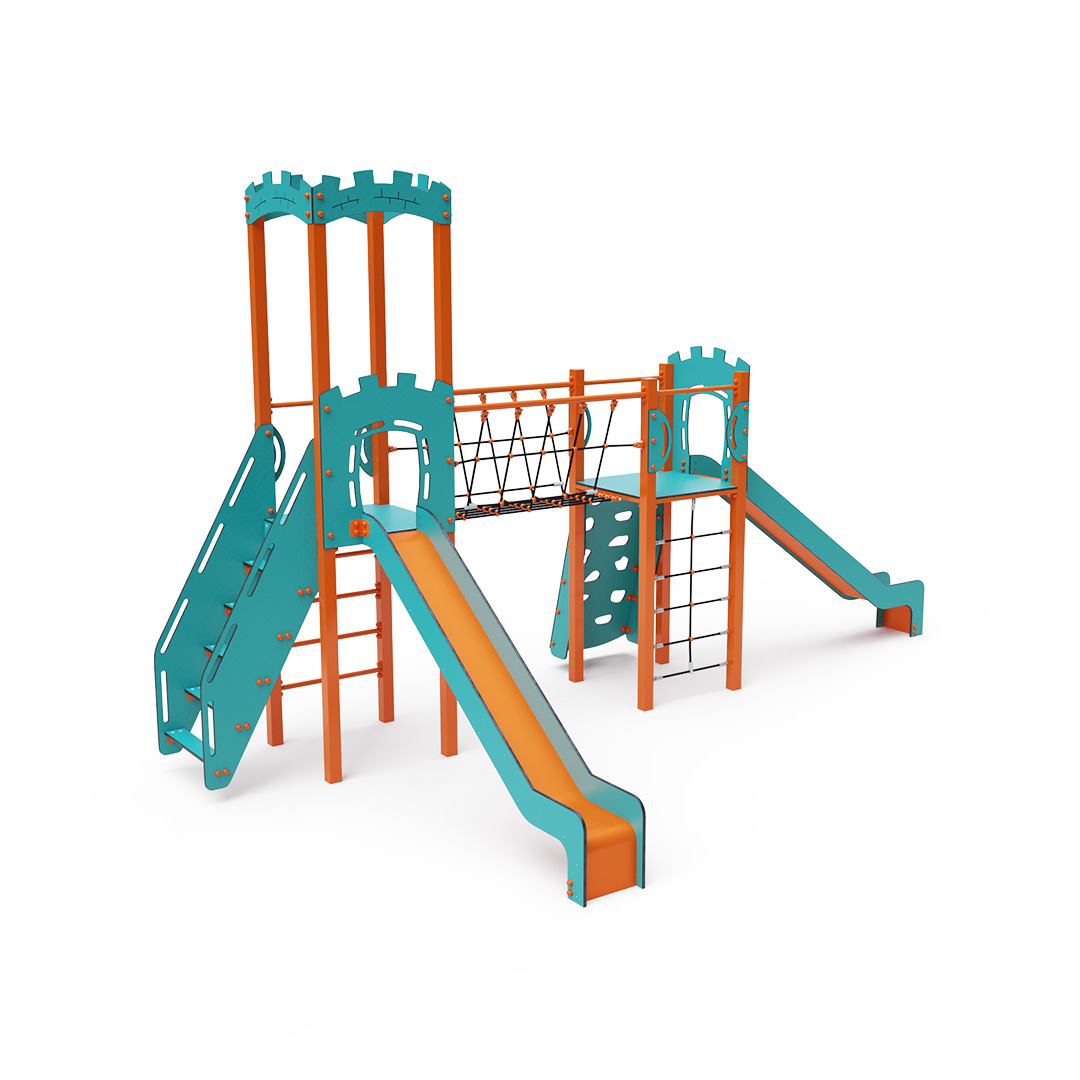 A kéttornyú játszóvár tartó szerkezete horganyzott és porszórt acélból, padlói, ferde mászófala, lépcsője, koronája és a mellvédek HPL jelölésű magas nyomású laminált kompaktlemezből, kötélrendszere acélmagos poliészter kötélből, csúszdái pedig HDPE műanyag és HPL kompaktlemez kombinációjából készülnek. A magas nyomású HPL lemez törhetetlen, nem mérgező, újrahasznosítható, továbbá vegyszer- és UV álló. A poliészter szálakból készült acélmagos kötél magas szilárdsággal bír és ezáltal jobban ellenáll a mechanikai igénybevételnek. Maga a poliészter számos pozitív tulajdonsággal rendelkezik. Színtartó, ellenáll a mikroorganizmusoknak, az időjárási hatásoknak, (pl. eső után gyorsan szárad). A HDPE jelölésű, nagy sűrűségű polietilén lapokat főként magas szilárdságuk, szívósságuk és nedvességállóságuk jellemzik. Minden kötőelem rozsdamentes acélból készül és a fokozott tartósság és biztonság érdekében műanyag kupakkal van lezárva. A használt anyagoknak köszönhetően az eszköz minimális karbantartást igényel! A játékeszközt úgy terveztük, hogy a hosszú élettartam mellett a maximális biztonságot is garantálja!