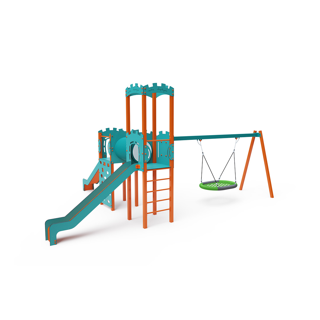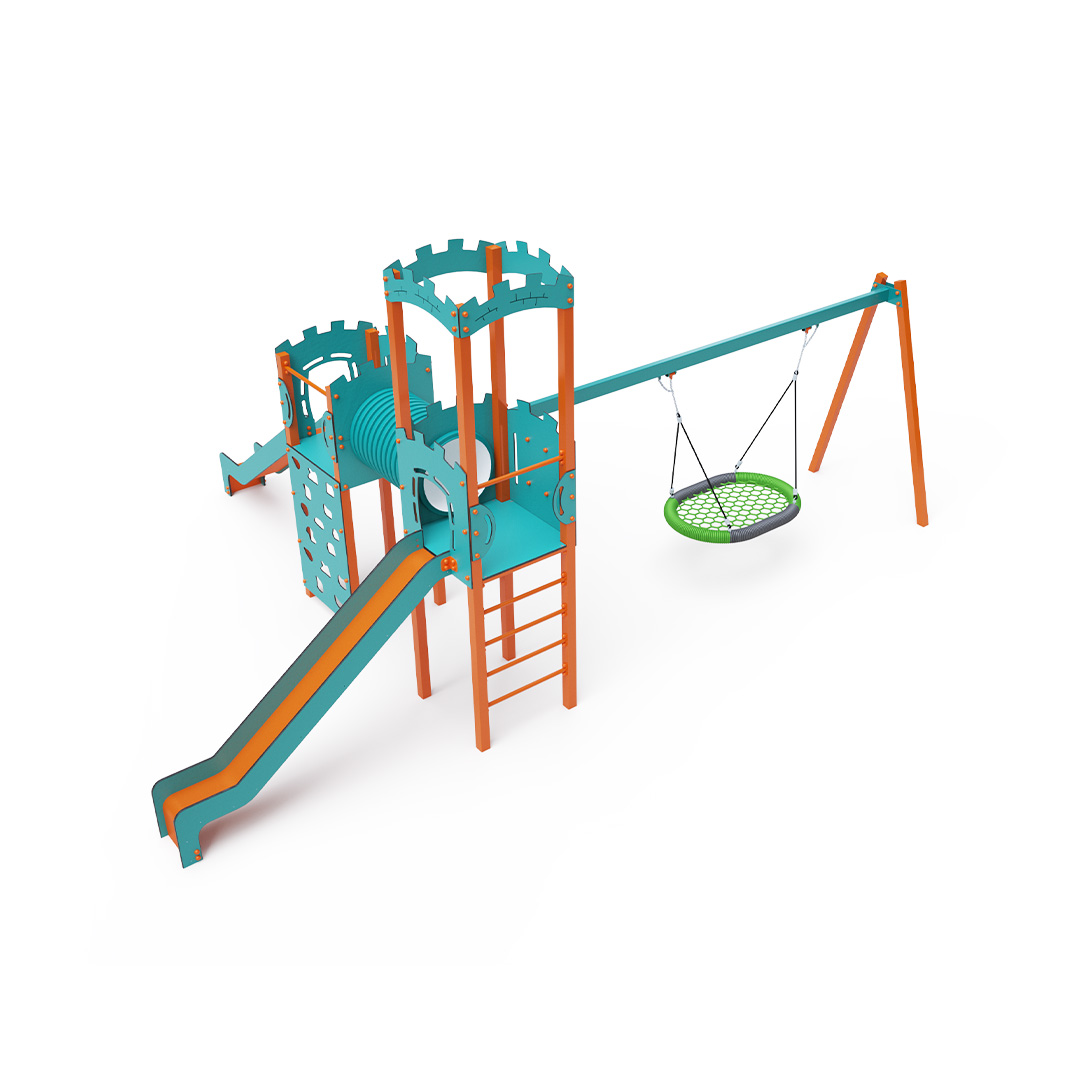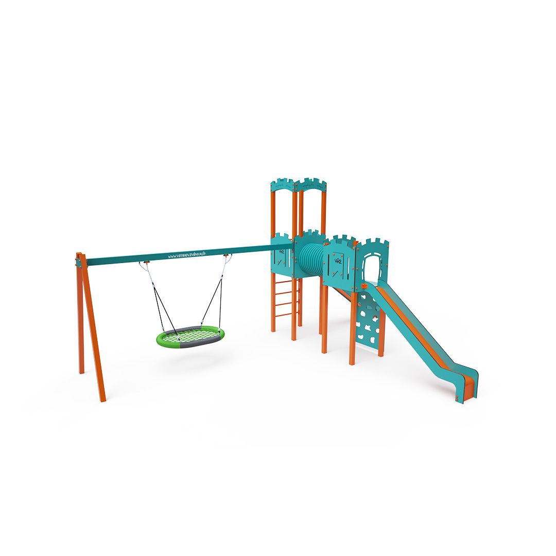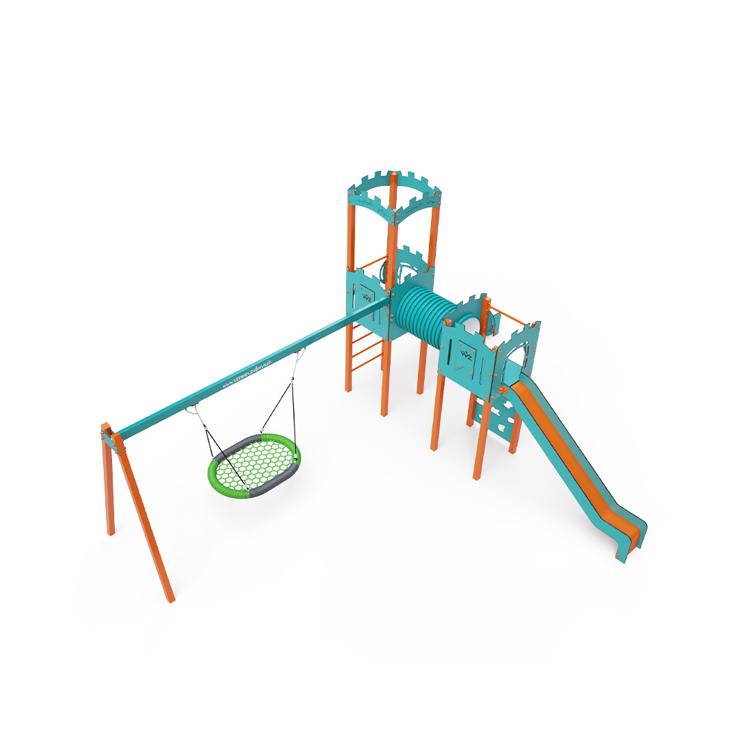 A fészekhintával kibővített kéttornyú játszóvár tartó szerkezete horganyzott és porszórt acélból, padlói, függőleges mászófala, koronája és a mellvédek HPL jelölésű magas nyomású laminált kompaktlemezből, alagútrendszere UV álló PVC-U csőből, csúszdája pedig HDPE műanyag és HPL kompaktlemez kombinációjából készül. A magas nyomású HPL lemez törhetetlen, nem mérgező, újrahasznosítható, továbbá vegyszer- és UV álló. A HDPE jelölésű, nagy sűrűségű polietilén lapokat főként magas szilárdságuk, szívósságuk és nedvességállóságuk jellemzik. Minden kötőelem rozsdamentes acélból készül és a fokozott tartósság és biztonság érdekében műanyag kupakkal van lezárva. A használt anyagoknak köszönhetően az eszköz minimális karbantartást igényel! A játékeszközt úgy terveztük, hogy a hosszú élettartam mellett a maximális biztonságot is garantálja!