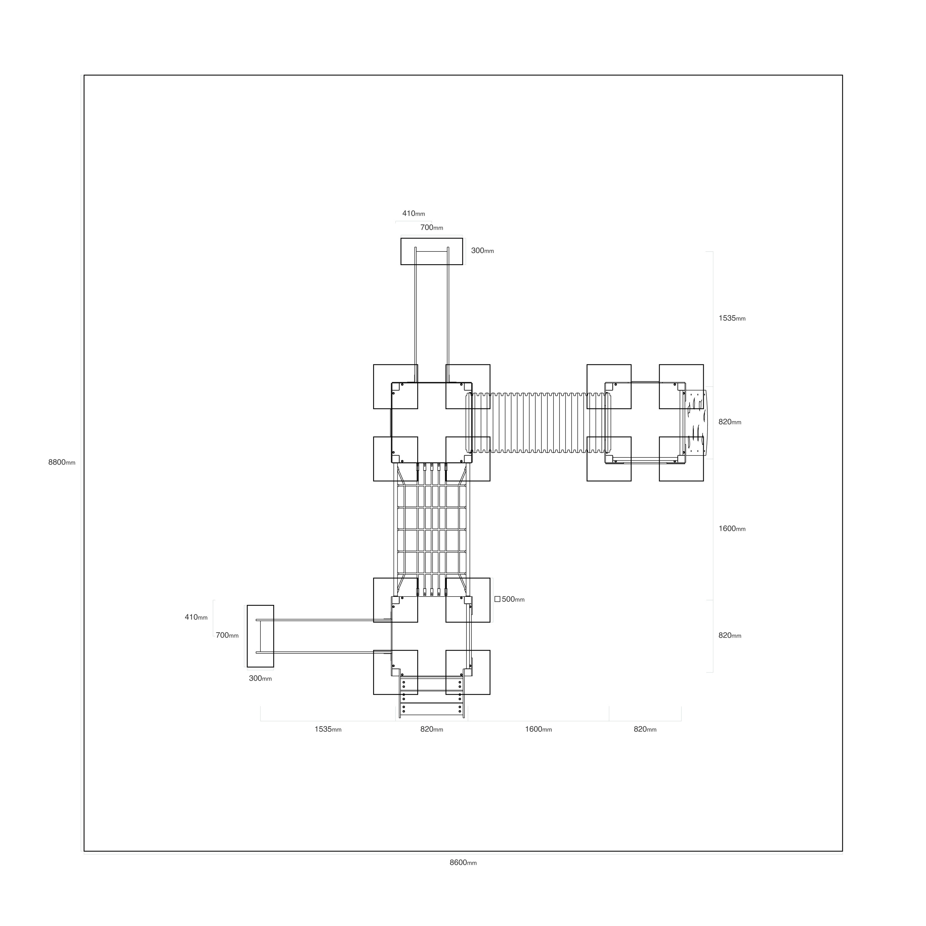 - Használt anyagok: horganyzott és porszórt acélszerkezet, UV álló polivinil-klorid PVC-U jelölésű alagút, acélmagos poliészter kötél, 6, 10 és 15 mm vastagságú magas nyomású HPL laminált kompaktlemez, HDPE nagy sűrűségű polietilén, rozsdamentes acél kötőelemek