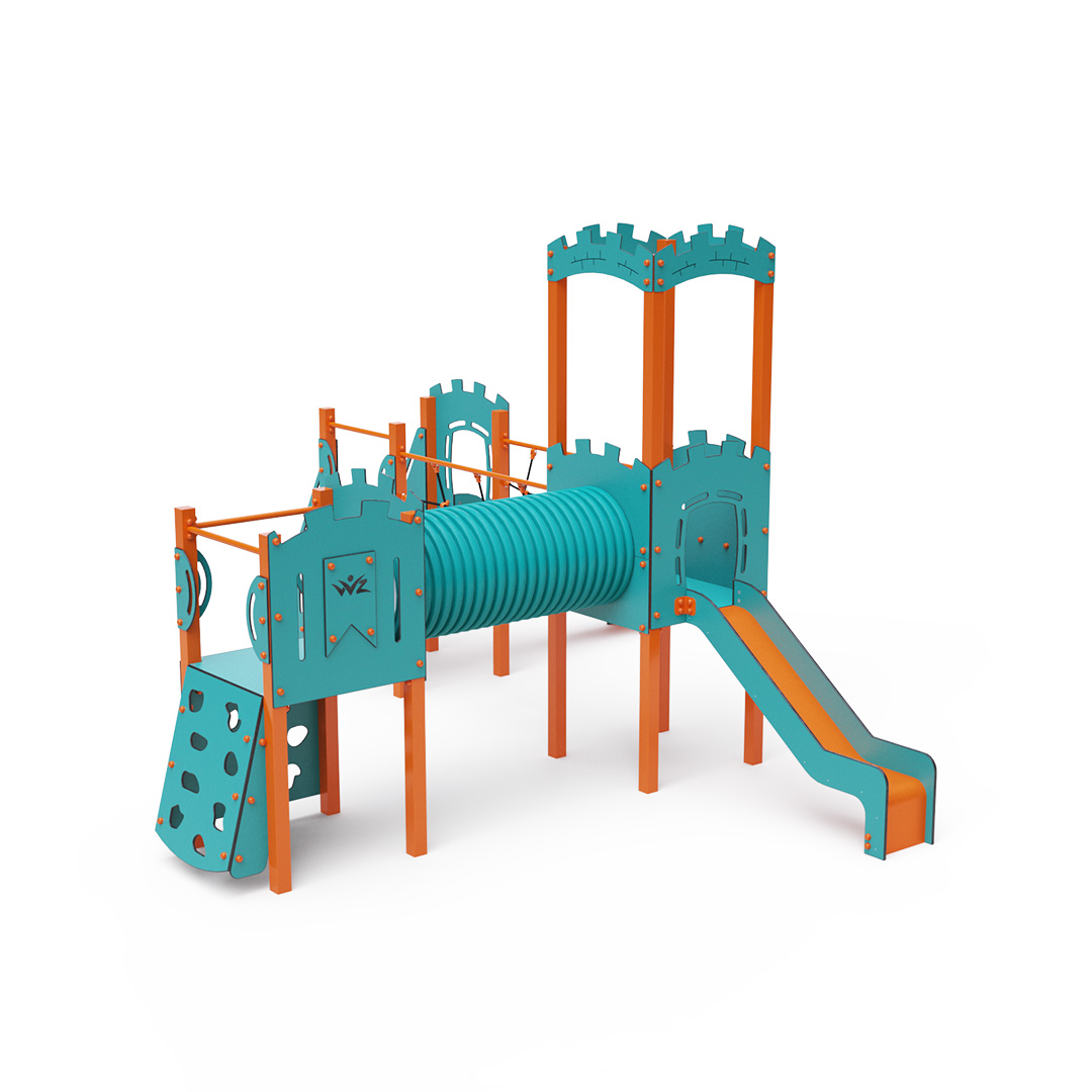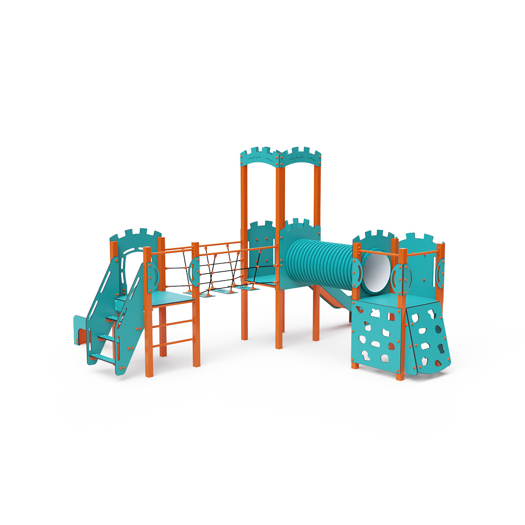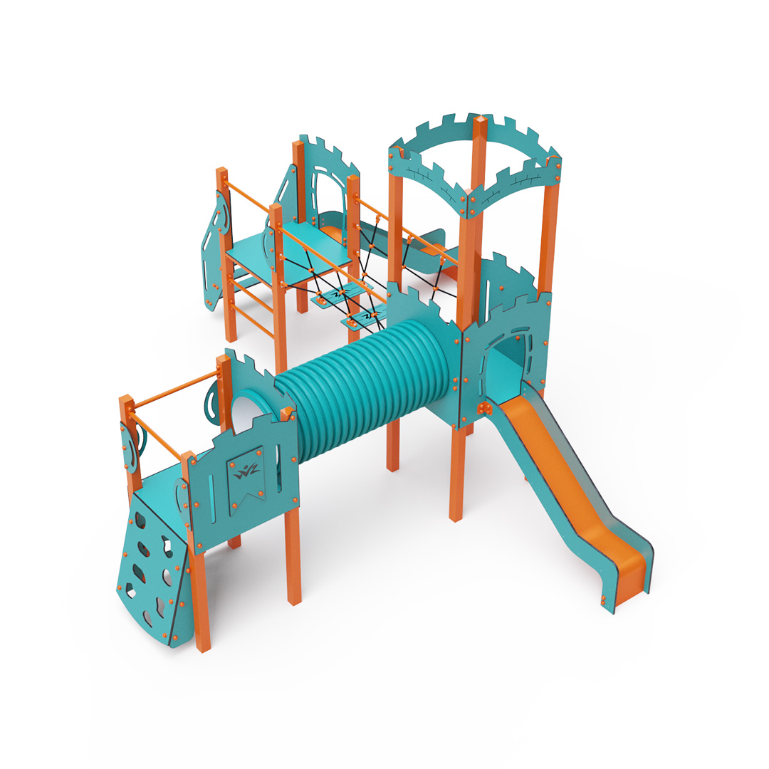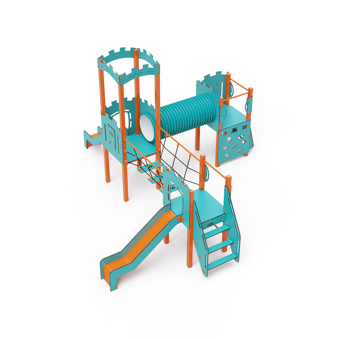 A háromtornyú játszóvár tartó szerkezete horganyzott és porszórt acélból, padlói, mászófalai, lépcsője, koronája és a mellvédek HPL jelölésű magas nyomású laminált kompaktlemezből, alagútrendszere UV álló PVC-U csőből, kötélrendszere acélmagos poliészter kötélből, csúszdái pedig HDPE műanyag és HPL kompaktlemez kombinációjából készülnek. A magas nyomású HPL lemez törhetetlen, nem mérgező, újrahasznosítható, továbbá vegyszer- és UV álló. A poliészter szálakból készült acélmagos kötél magas szilárdsággal bír és ezáltal jobban ellenáll a mechanikai igénybevételnek. Maga a poliészter számos pozitív tulajdonsággal rendelkezik. Színtartó, ellenáll a mikroorganizmusoknak, az időjárási hatásoknak, (pl. eső után gyorsan szárad). A HDPE jelölésű, nagy sűrűségű polietilén lapokat főként magas szilárdságuk, szívósságuk és nedvességállóságuk jellemzik. Minden kötőelem rozsdamentes acélból készül és a fokozott tartósság és biztonság érdekében műanyag kupakkal van lezárva. A használt anyagoknak köszönhetően az eszköz minimális karbantartást igényel! A játékeszközt úgy terveztük, hogy a hosszú élettartam mellett a maximális biztonságot is garantálja! A türkiz-narancssárga dizájn már messziről játékra invitálja a gyermeket.