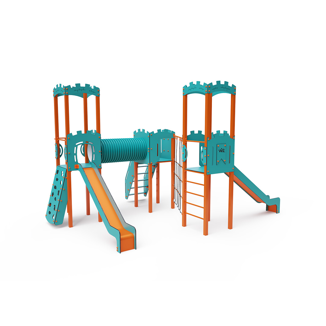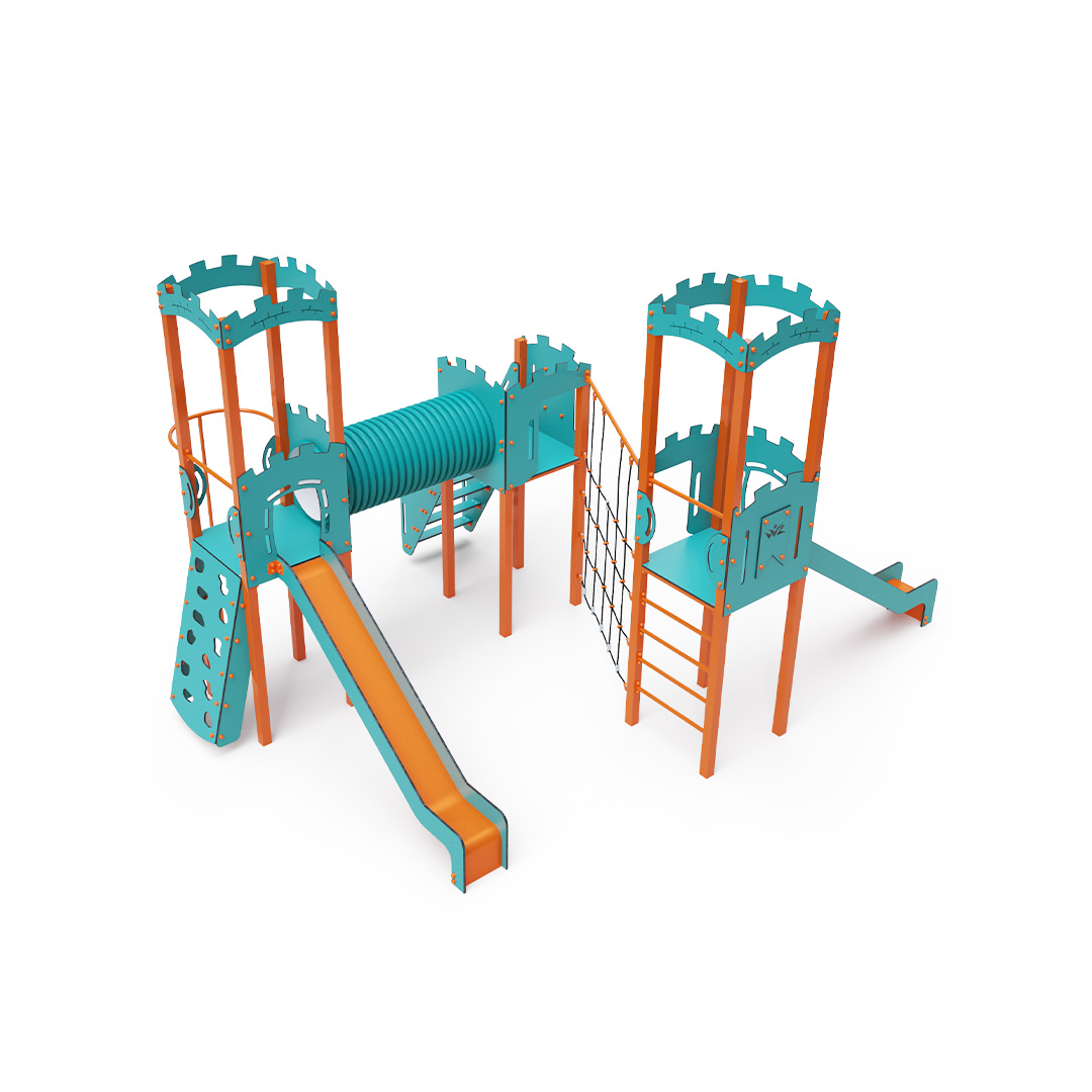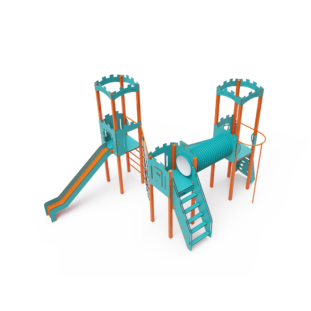 A háromtornyú játszóvár tartó szerkezete horganyzott és porszórt acélból, padlói, ferde mászófala, lépcsője, koronái és a mellvédek HPL jelölésű magas nyomású laminált kompaktlemezből, alagútrendszere UV álló PVC-U csőből, kötélrendszere acélmagos poliészter kötélből, csúszdái pedig HDPE műanyag és HPL kompaktlemez kombinációjából készülnek. A magas nyomású HPL lemez törhetetlen, nem mérgező, újrahasznosítható, továbbá vegyszer- és UV álló. A poliészter szálakból készült acélmagos kötél magas szilárdsággal bír és ezáltal jobban ellenáll a mechanikai igénybevételnek. Maga a poliészter számos pozitív tulajdonsággal rendelkezik. Színtartó, ellenáll a mikroorganizmusoknak, az időjárási hatásoknak, (pl. eső után gyorsan szárad). A HDPE jelölésű, nagy sűrűségű polietilén lapokat főként magas szilárdságuk, szívósságuk és nedvességállóságuk jellemzik. Minden kötőelem rozsdamentes acélból készül és a fokozott tartósság és biztonság érdekében műanyag kupakkal van lezárva. A használt anyagoknak köszönhetően az eszköz minimális karbantartást igényel! A játékeszközt úgy terveztük, hogy a hosszú élettartam mellett a maximális biztonságot is garantálja!