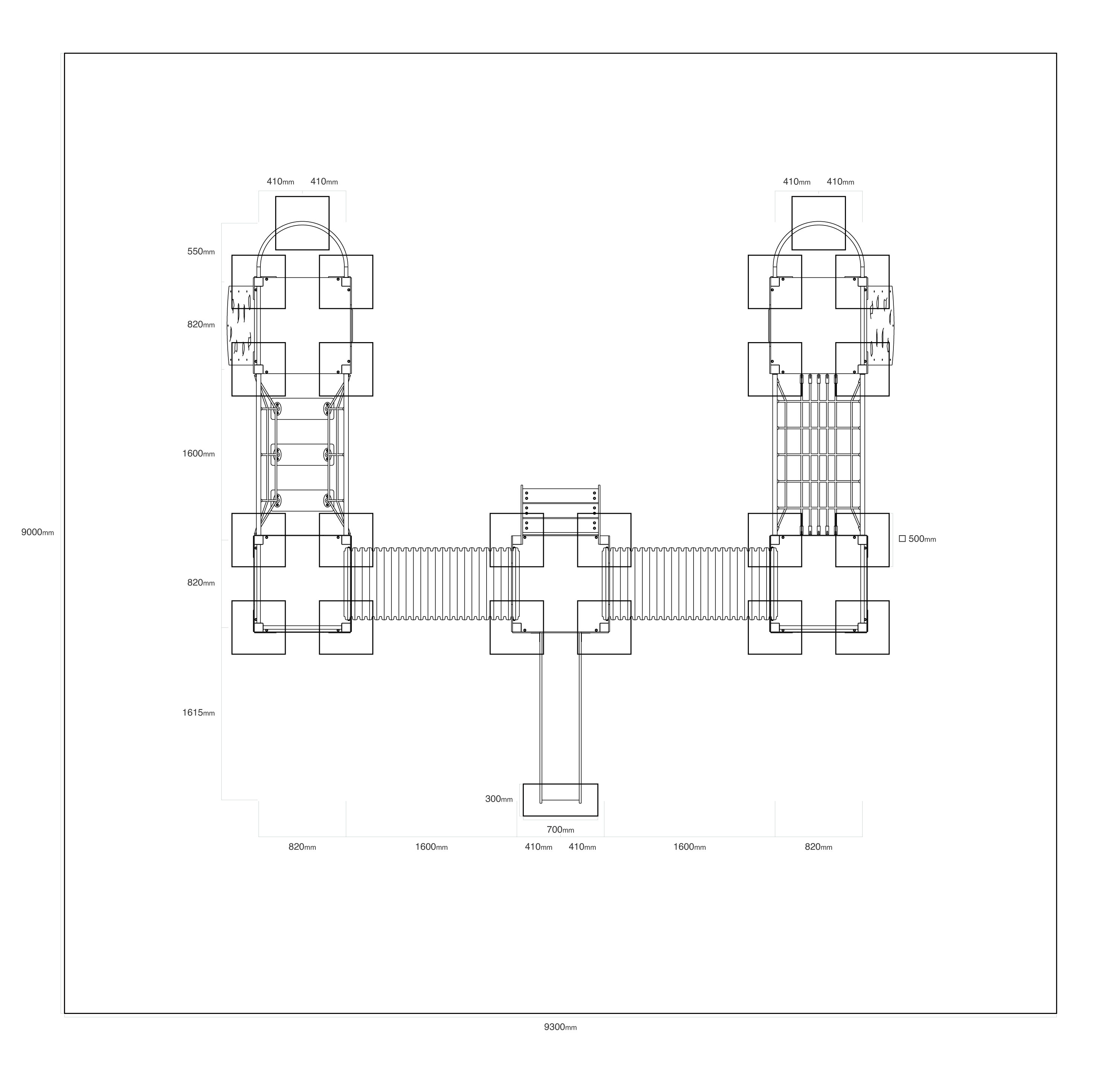 - Használt anyagok: horganyzott és porszórt acélszerkezet, UV álló polivinil-klorid PVC-U jelölésű alagút, acélmagos poliészter kötél, 6, 10 és 15 mm vastagságú magas nyomású HPL laminált kompaktlemez, HDPE nagy sűrűségű polietilén, rozsdamentes acél kötőelemek