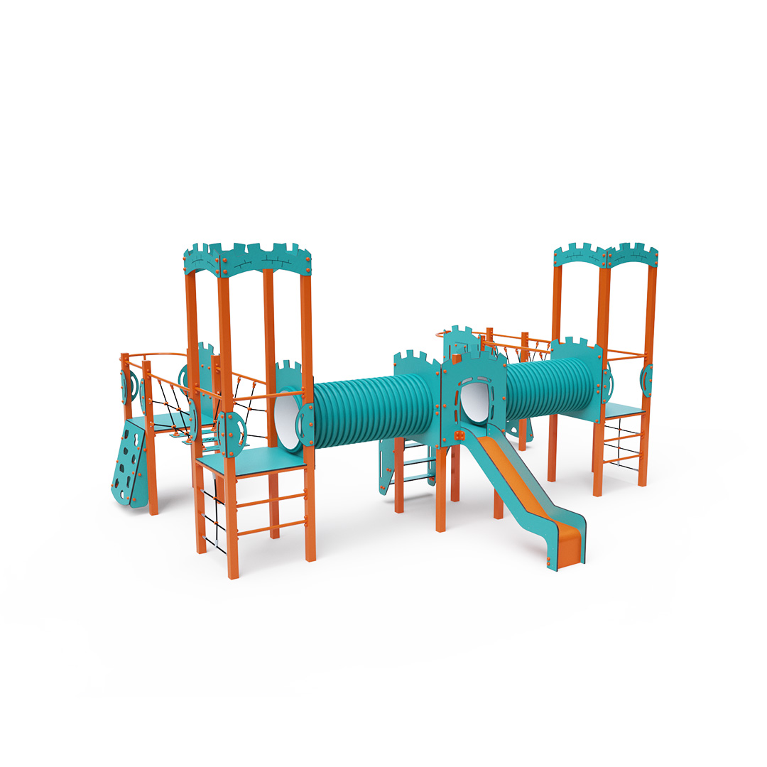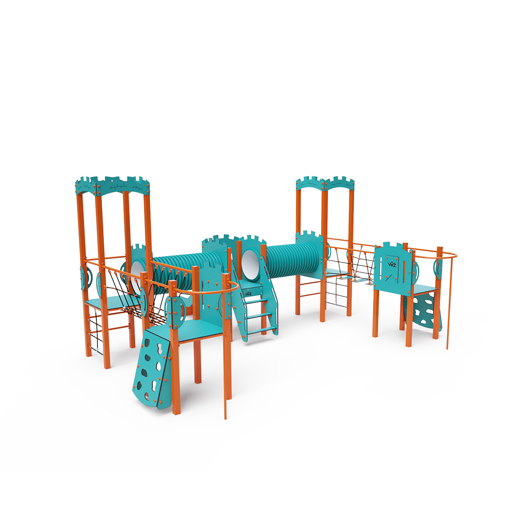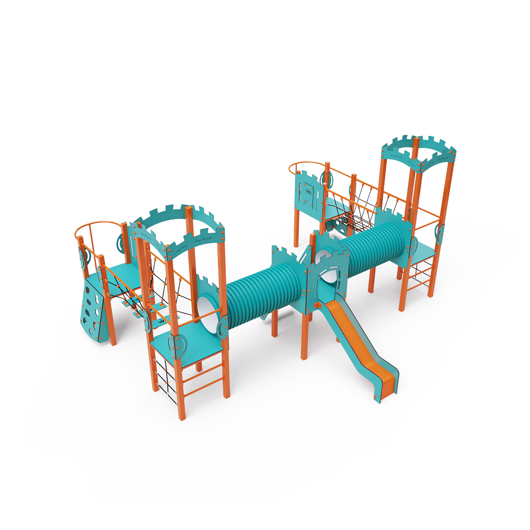 Az öttornyú játszóvár tartó szerkezete horganyzott és porszórt acélból, padlói, ferde mászófalai, lépcsője, koronái és a mellvédek HPL jelölésű magas nyomású laminált kompaktlemezből, alagútrendszere UV álló PVC-U csőből, kötélrendszere acélmagos poliészter kötélből, csúszdája pedig HDPE műanyag és HPL kompaktlemez kombinációjából készül. A magas nyomású HPL lemez törhetetlen, nem mérgező, újrahasznosítható, továbbá vegyszer- és UV álló. A poliészter szálakból készült acélmagos kötél magas szilárdsággal bír és ezáltal jobban ellenáll a mechanikai igénybevételnek. Maga a poliészter számos pozitív tulajdonsággal rendelkezik. Színtartó, ellenáll a mikroorganizmusoknak, az időjárási hatásoknak, (pl. eső után gyorsan szárad). A HDPE jelölésű, nagy sűrűségű polietilén lapokat főként magas szilárdságuk, szívósságuk és nedvességállóságuk jellemzik. Minden kötőelem rozsdamentes acélból készül és a fokozott tartósság és biztonság érdekében műanyag kupakkal van lezárva. A használt anyagoknak köszönhetően az eszköz minimális karbantartást igényel! A játékeszközt úgy terveztük, hogy a hosszú élettartam mellett a maximális biztonságot is garantálja!