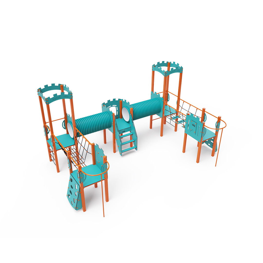 - lépcső, csúszda, 2× alagút, 2× ferde mászófal, 2× függőleges kötélháló, 2× kötélhíd, 2× tűzoltócső, 2× függőleges létra
