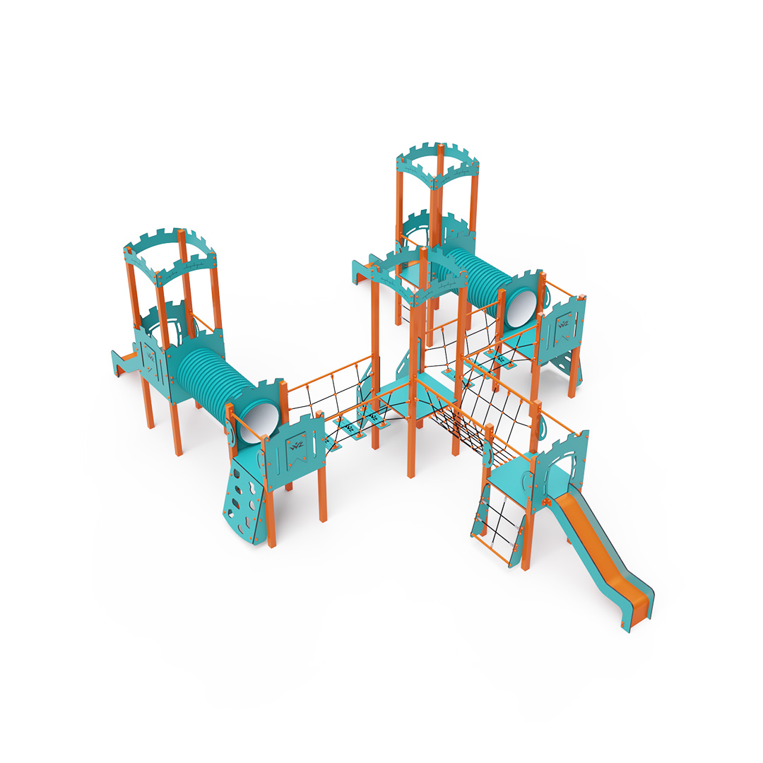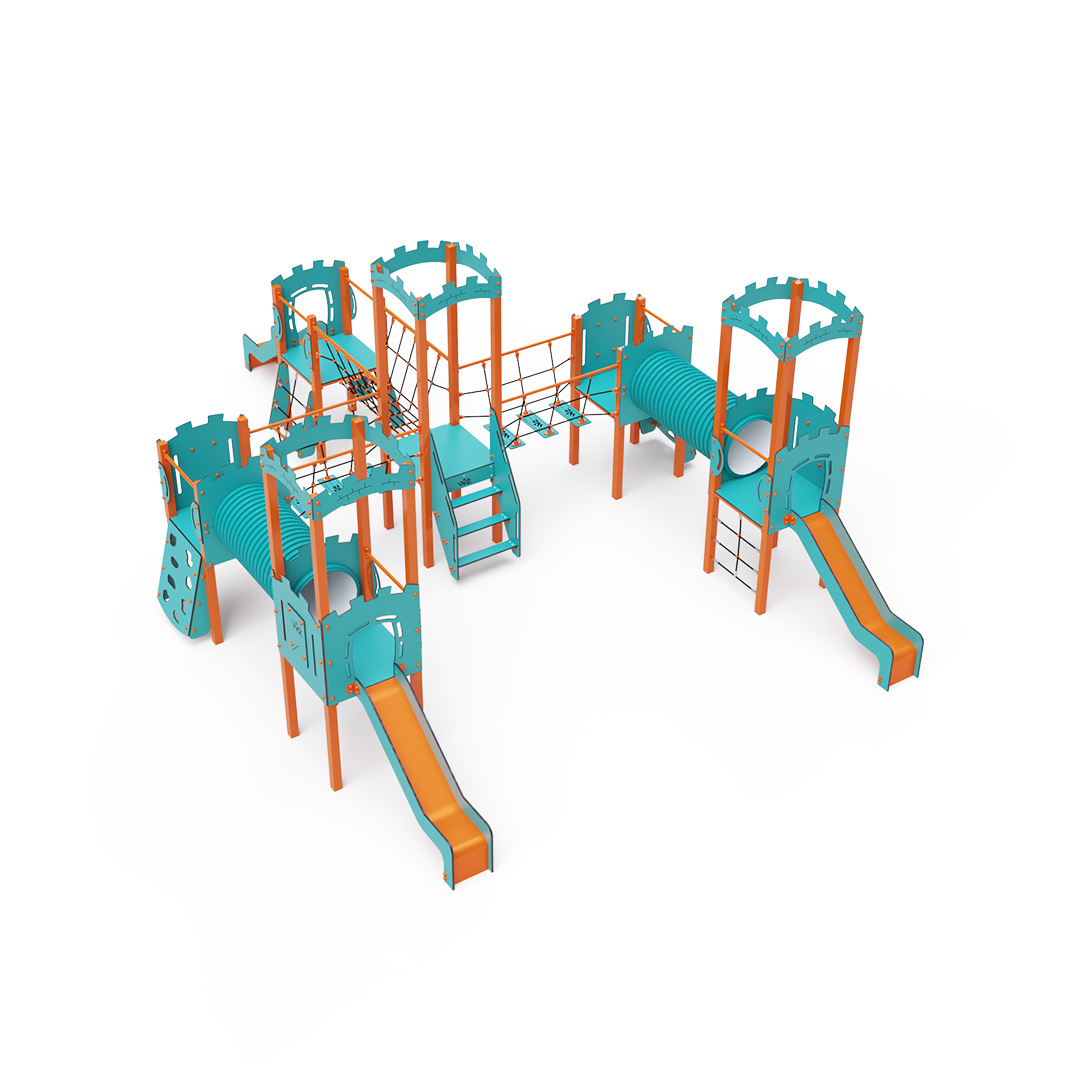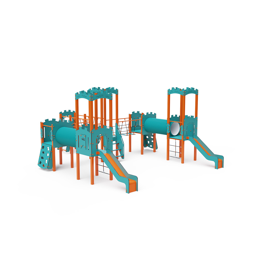 A hattornyú játszóvár tartó szerkezete horganyzott és porszórt acélból, padlói, mászófalai, lépcsője, koronái és a mellvédek HPL jelölésű magas nyomású laminált kompaktlemezből, alagútrendszere UV álló PVC-U csőből, kötélrendszere acélmagos poliészter kötélből, csúszdái pedig HDPE műanyag és HPL kompaktlemez kombinációjából készülnek. A magas nyomású HPL lemez törhetetlen, nem mérgező, újrahasznosítható, továbbá vegyszer- és UV álló. A poliészter szálakból készült acélmagos kötél magas szilárdsággal bír és ezáltal jobban ellenáll a mechanikai igénybevételnek. Maga a poliészter számos pozitív tulajdonsággal rendelkezik. Színtartó, ellenáll a mikroorganizmusoknak, az időjárási hatásoknak, (pl. eső után gyorsan szárad). A HDPE jelölésű, nagy sűrűségű polietilén lapokat főként magas szilárdságuk, szívósságuk és nedvességállóságuk jellemzik. Minden kötőelem rozsdamentes acélból készül és a fokozott tartósság és biztonság érdekében műanyag kupakkal van lezárva. A használt anyagoknak köszönhetően az eszköz minimális karbantartást igényel! A játékeszközt úgy terveztük, hogy a hosszú élettartam mellett a maximális biztonságot is garantálja!