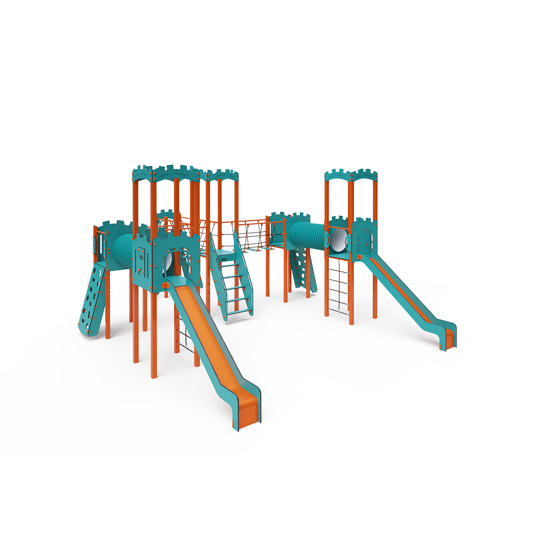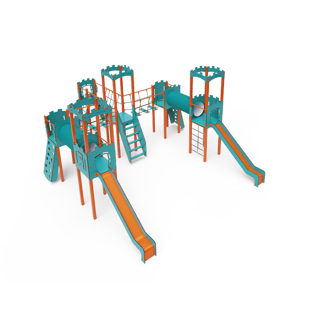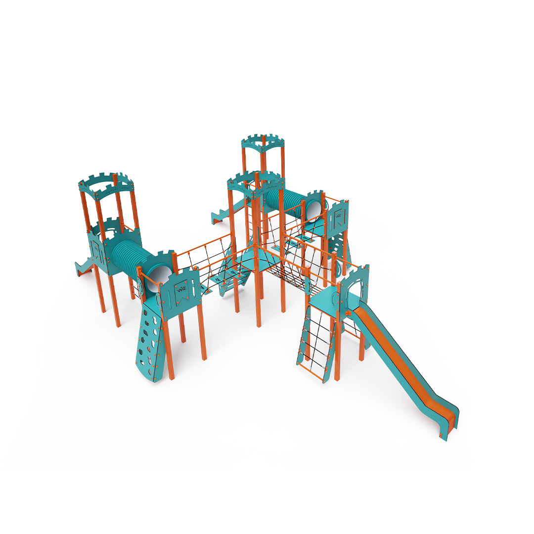 A hattornyú játszóvár tartó szerkezete horganyzott és porszórt acélból, padlói, mászófalai, lépcsője, koronái és a mellvédek HPL jelölésű magas nyomású laminált kompaktlemezből, alagútrendszere UV álló PVC-U csőből, kötélrendszere acélmagos poliészter kötélből, csúszdái pedig HDPE műanyag és HPL kompaktlemez kombinációjából készülnek. A magas nyomású HPL lemez törhetetlen, nem mérgező, újrahasznosítható, továbbá vegyszer- és UV álló. A poliészter szálakból készült acélmagos kötél magas szilárdsággal bír és ezáltal jobban ellenáll a mechanikai igénybevételnek. Maga a poliészter számos pozitív tulajdonsággal rendelkezik. Színtartó, ellenáll a mikroorganizmusoknak, az időjárási hatásoknak, (pl. eső után gyorsan szárad). A HDPE jelölésű, nagy sűrűségű polietilén lapokat főként magas szilárdságuk, szívósságuk és nedvességállóságuk jellemzik. Minden kötőelem rozsdamentes acélból készül és a fokozott tartósság és biztonság érdekében műanyag kupakkal van lezárva. A használt anyagoknak köszönhetően az eszköz minimális karbantartást igényel! A játékeszközt úgy terveztük, hogy a hosszú élettartam mellett a maximális biztonságot is garantálja!