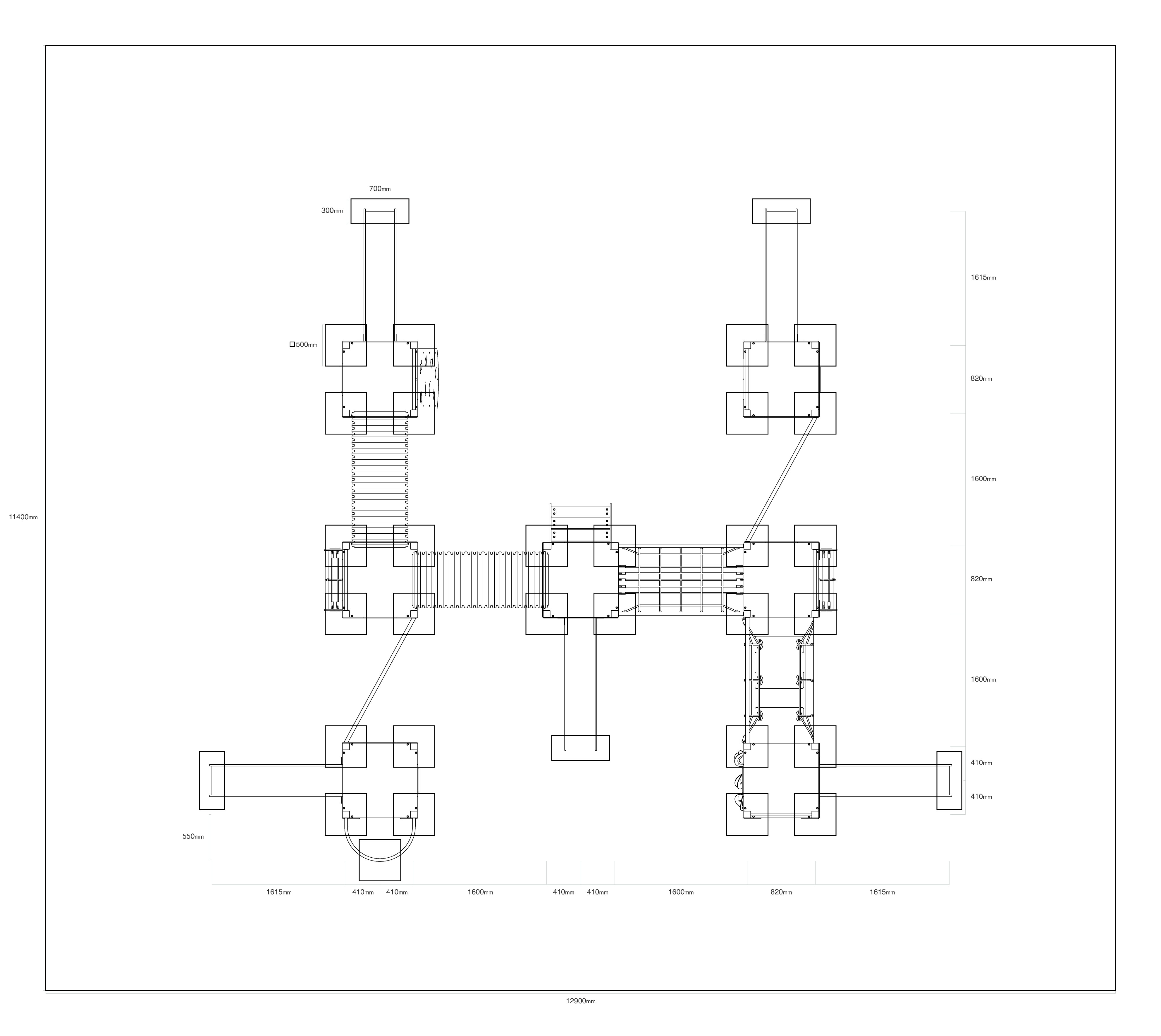 - lépcső, függőleges mászófal, ferde mászófal, amőba, abakusz, tűzoltócső, 2× alagút, 2x kötélhíd, 2× ferde kötélháló, 3× függőleges kötélháló, 5× csúszda