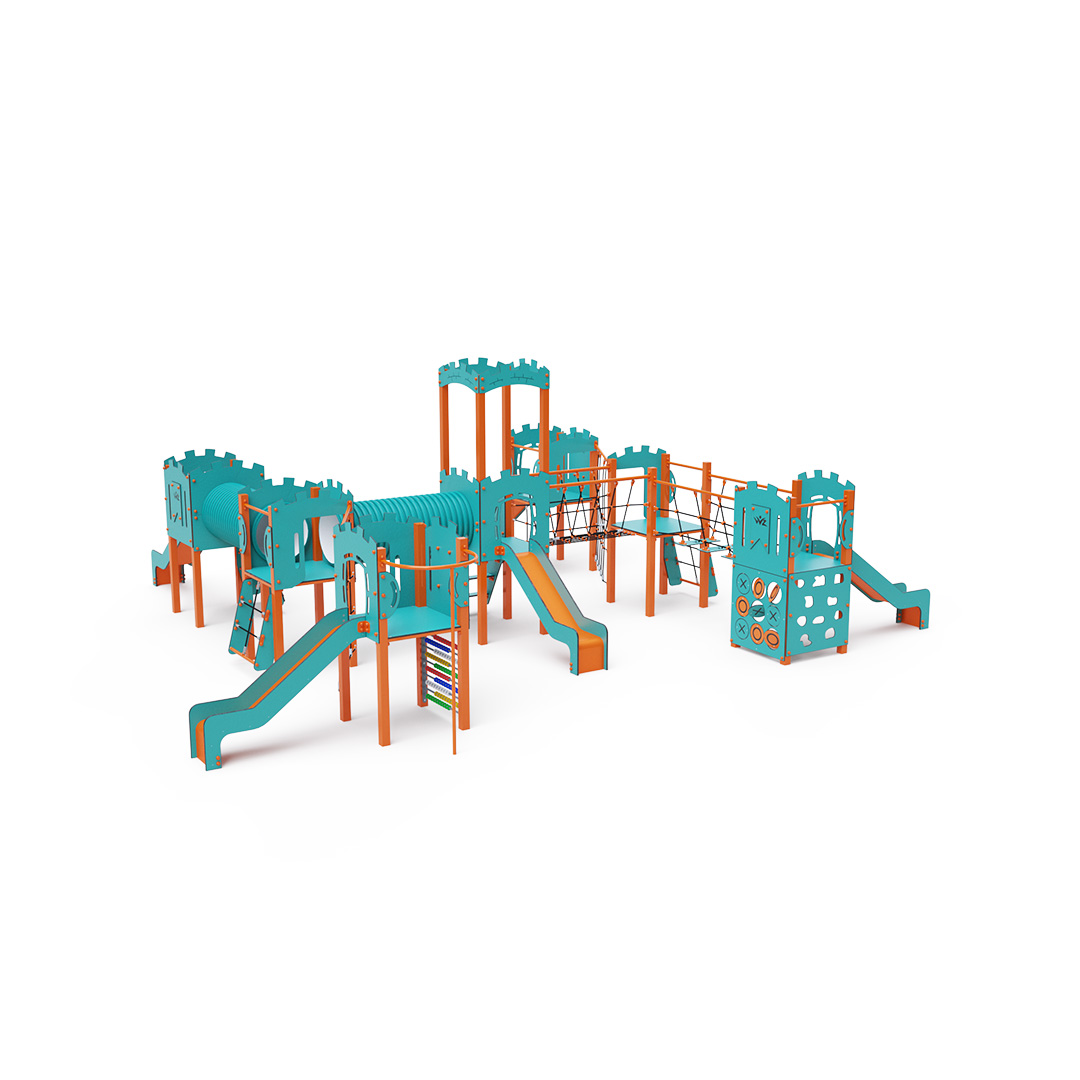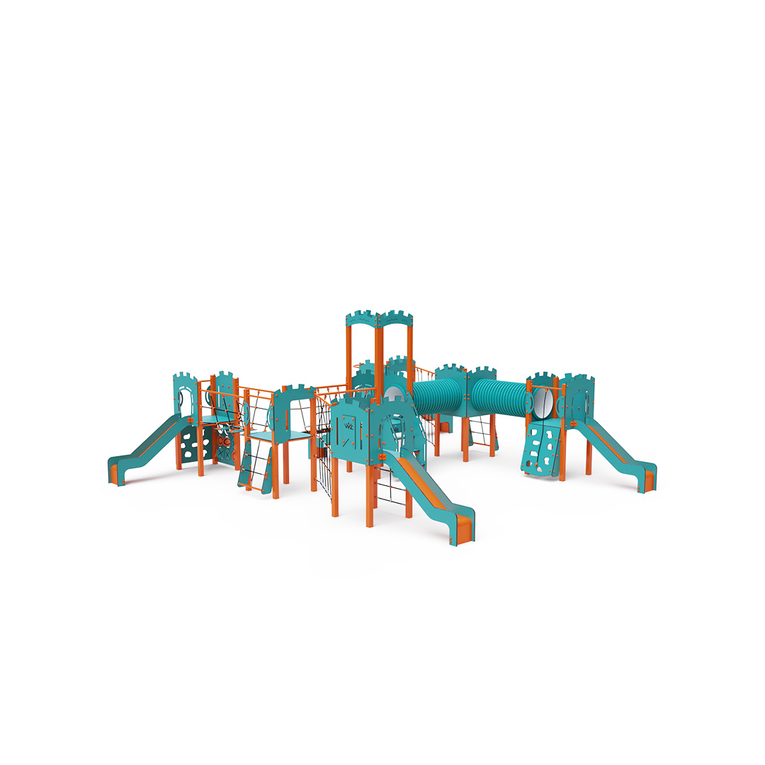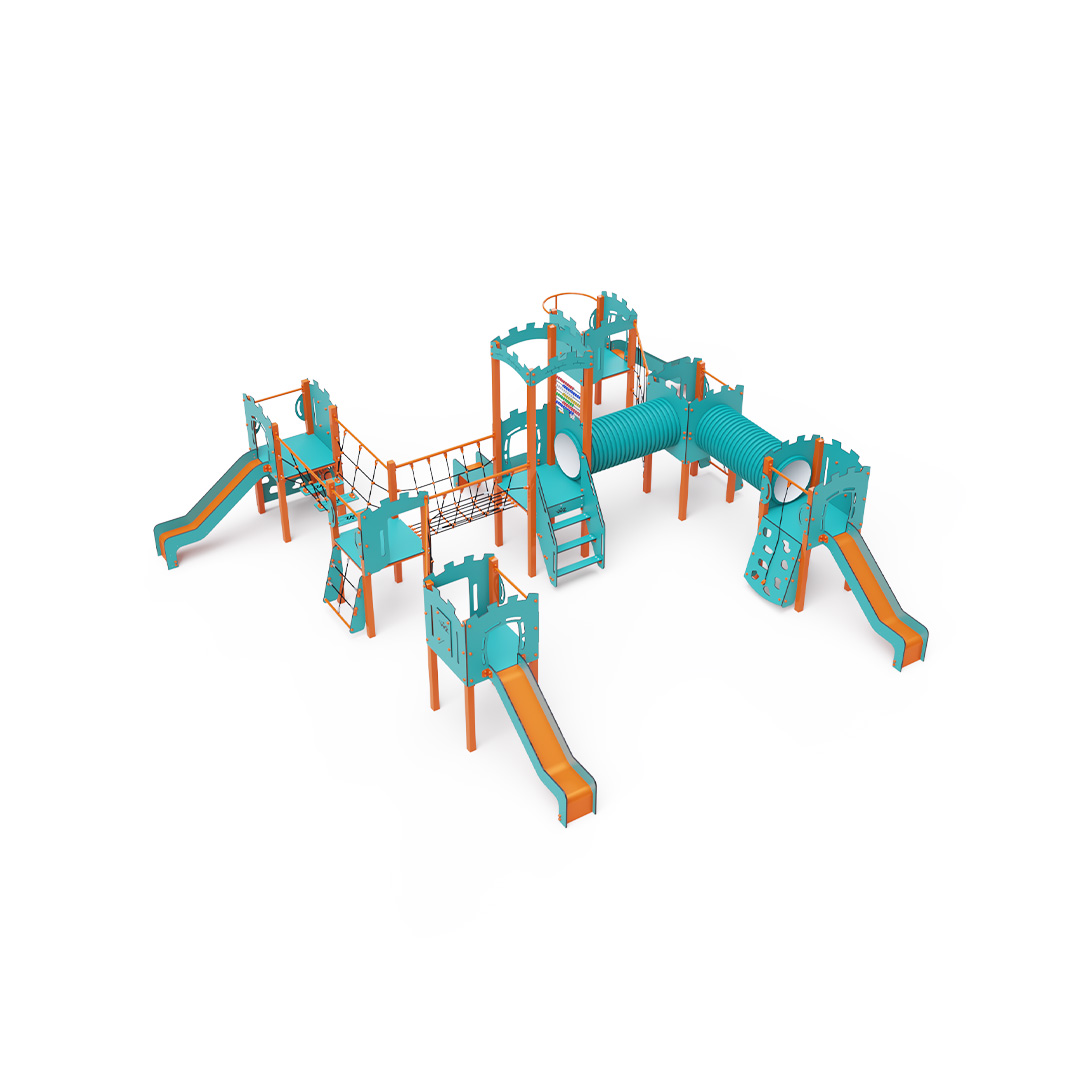 A héttornyú játszóvár tartó szerkezete horganyzott és porszórt acélból, padlói, mászófalai, lépcsője, amőbája, koronája és a mellvédek HPL jelölésű magas nyomású laminált kompaktlemezből, alagútrendszere UV álló PVC-U csőből, kötélrendszere acélmagos poliészter kötélből, csúszdái pedig HDPE műanyag és HPL kompaktlemez kombinációjából készülnek. A magas nyomású HPL lemez törhetetlen, nem mérgező, újrahasznosítható, továbbá vegyszer- és UV álló. A poliészter szálakból készült acélmagos kötél magas szilárdsággal bír és ezáltal jobban ellenáll a mechanikai igénybevételnek. Maga a poliészter számos pozitív tulajdonsággal rendelkezik. Színtartó, ellenáll a mikroorganizmusoknak, az időjárási hatásoknak, (pl. eső után gyorsan szárad). A HDPE jelölésű, nagy sűrűségű polietilén lapokat főként magas szilárdságuk, szívósságuk és nedvességállóságuk jellemzik. Minden kötőelem rozsdamentes acélból készül és a fokozott tartósság és biztonság érdekében műanyag kupakkal van lezárva. A használt anyagoknak köszönhetően az eszköz minimális karbantartást igényel! A játékeszközt úgy terveztük, hogy a hosszú élettartam mellett a maximális biztonságot is garantálja!