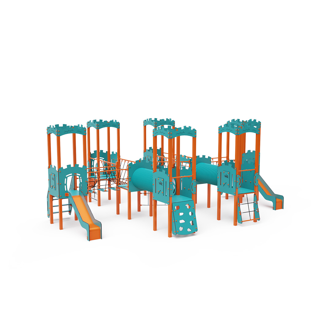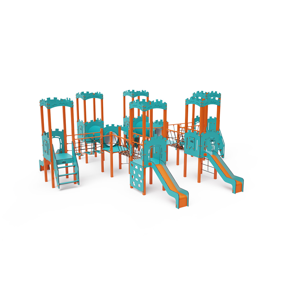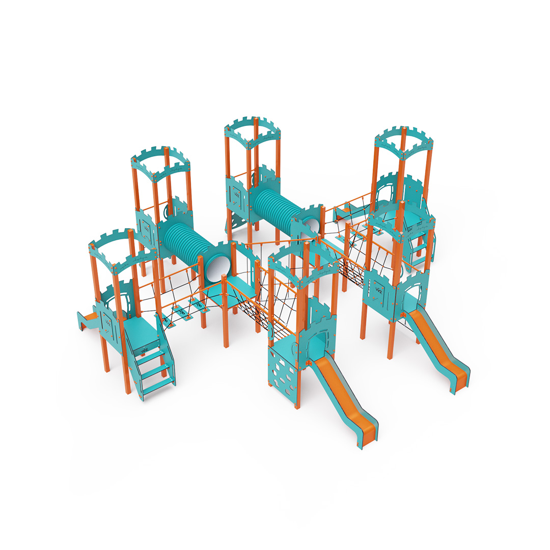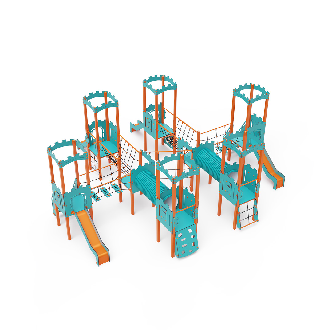 A nyolctornyú játszóvár tartó szerkezete horganyzott és porszórt acélból, padlói, mászófalai, lépcsői, koronái és a mellvédek HPL jelölésű magas nyomású laminált kompaktlemezből, alagútrendszere UV álló PVC-U csőből, kötélrendszere acélmagos poliészter kötélből, csúszdái pedig HDPE műanyag és HPL kompaktlemez kombinációjából készülnek. A magas nyomású HPL lemez törhetetlen, nem mérgező, újrahasznosítható, továbbá vegyszer- és UV álló. A poliészter szálakból készült acélmagos kötél magas szilárdsággal bír és ezáltal jobban ellenáll a mechanikai igénybevételnek. Maga a poliészter számos pozitív tulajdonsággal rendelkezik. Színtartó, ellenáll a mikroorganizmusoknak, az időjárási hatásoknak, (pl. eső után gyorsan szárad). A HDPE jelölésű, nagy sűrűségű polietilén lapokat főként magas szilárdságuk, szívósságuk és nedvességállóságuk jellemzik. Minden kötőelem rozsdamentes acélból készül és a fokozott tartósság és biztonság érdekében műanyag kupakkal van lezárva. A használt anyagoknak köszönhetően az eszköz minimális karbantartást igényel! A játékeszközt úgy terveztük, hogy a hosszú élettartam mellett a maximális biztonságot is garantálja!