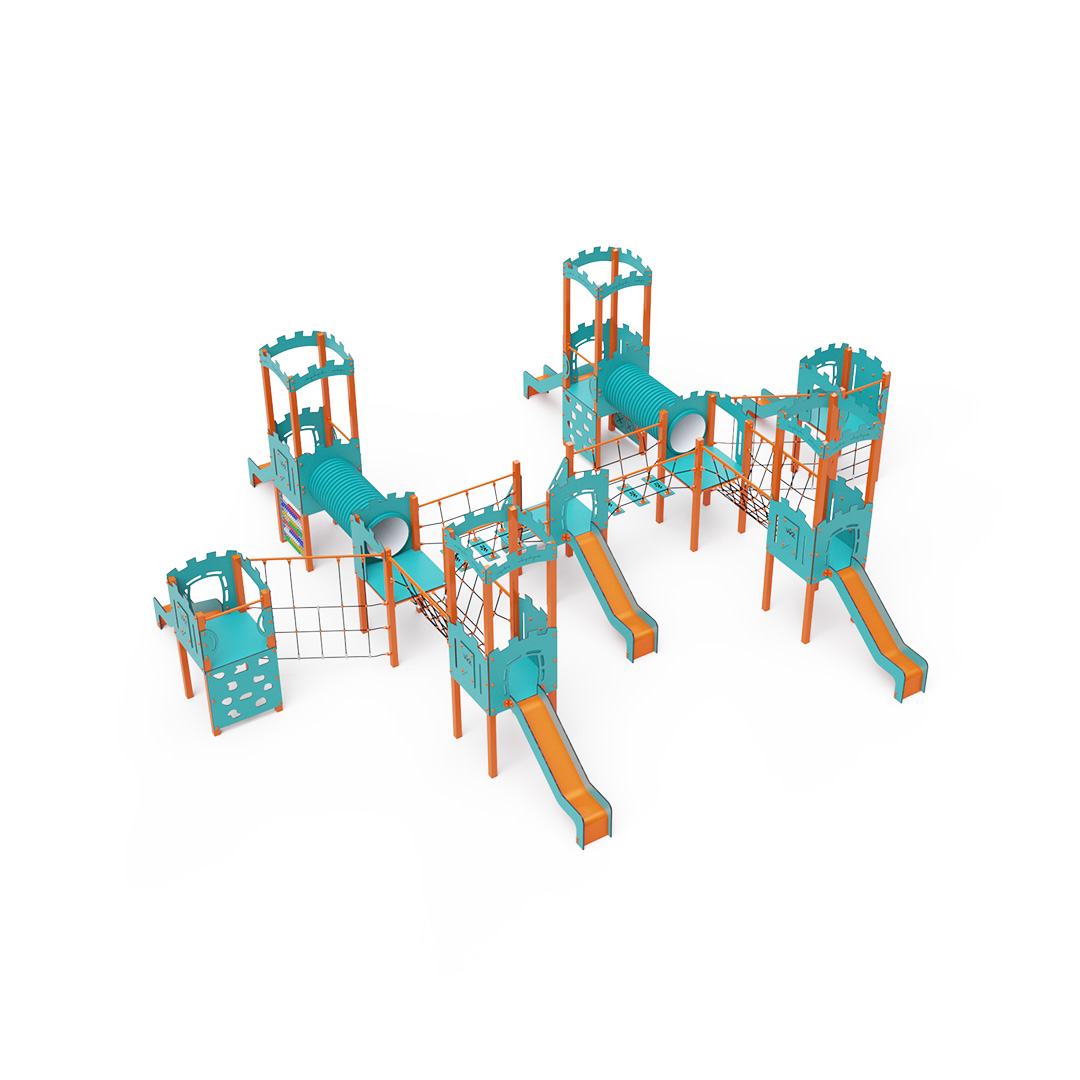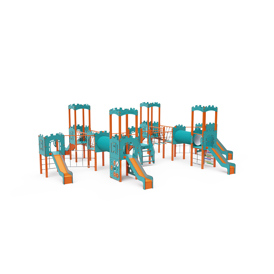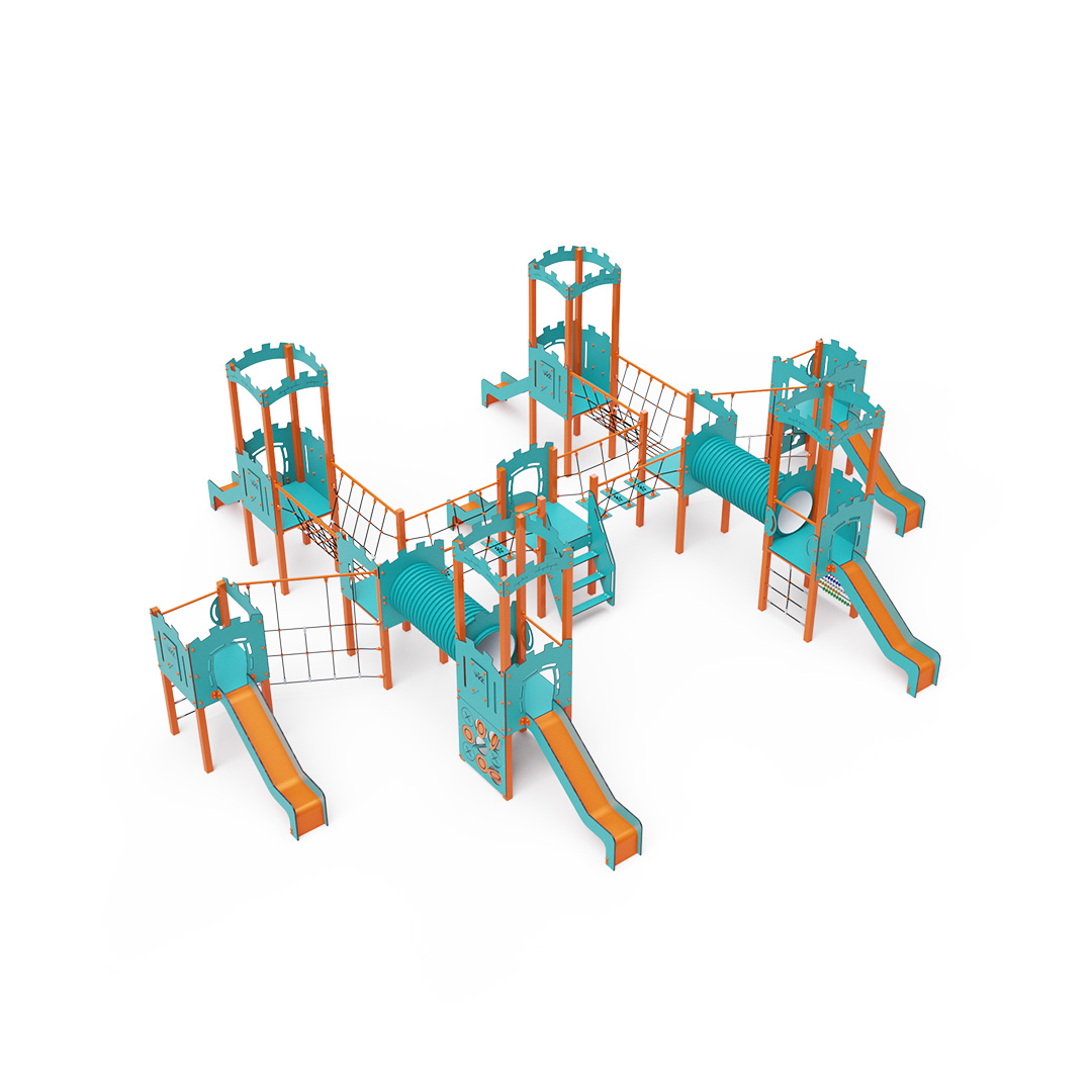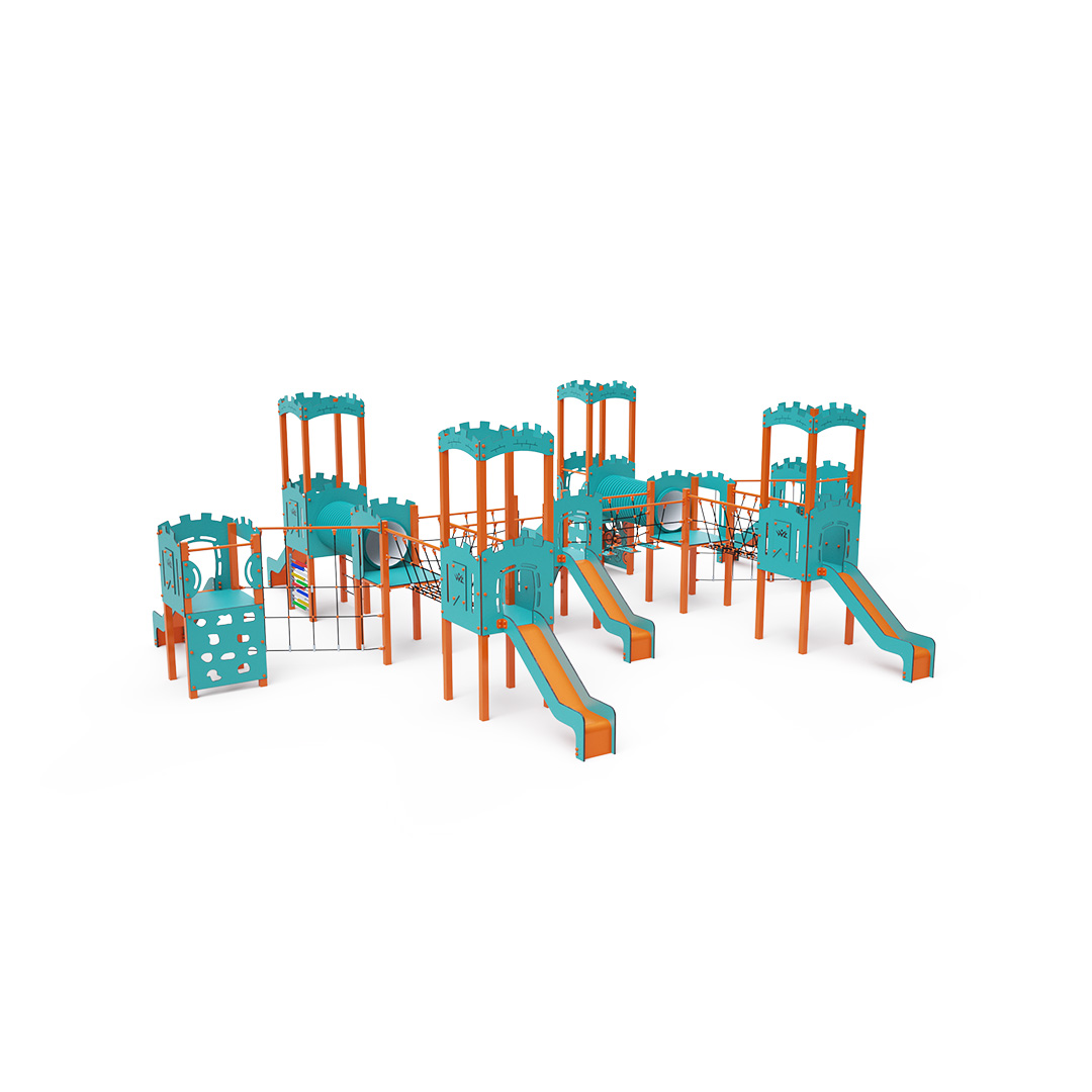 A kilenctornyú játszóvár tartó szerkezete horganyzott és porszórt acélból, padlói, mászófalai, lépcsője, amőbája, koronái és a mellvédek HPL jelölésű magas nyomású laminált kompaktlemezből, alagútrendszere UV álló PVC-U csőből, kötélrendszere acélmagos poliészter kötélből, csúszdái pedig HDPE műanyag és HPL kompaktlemez kombinációjából készülnek. A magas nyomású HPL lemez törhetetlen, nem mérgező, újrahasznosítható, továbbá vegyszer- és UV álló. A poliészter szálakból készült acélmagos kötél magas szilárdsággal bír és ezáltal jobban ellenáll a mechanikai igénybevételnek. Maga a poliészter számos pozitív tulajdonsággal rendelkezik. Színtartó, ellenáll a mikroorganizmusoknak, az időjárási hatásoknak, (pl. eső után gyorsan szárad). A HDPE jelölésű, nagy sűrűségű polietilén lapokat főként magas szilárdságuk, szívósságuk és nedvességállóságuk jellemzik. Minden kötőelem rozsdamentes acélból készül és a fokozott tartósság és biztonság érdekében műanyag kupakkal van lezárva. A használt anyagoknak köszönhetően az eszköz minimális karbantartást igényel! A játékeszközt úgy terveztük, hogy a hosszú élettartam mellett a maximális biztonságot is garantálja!
