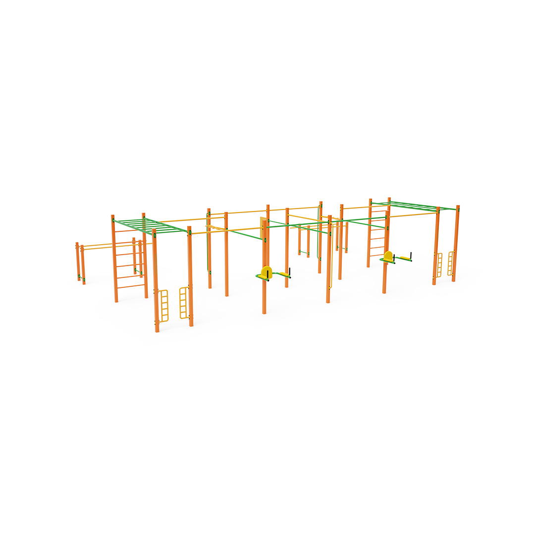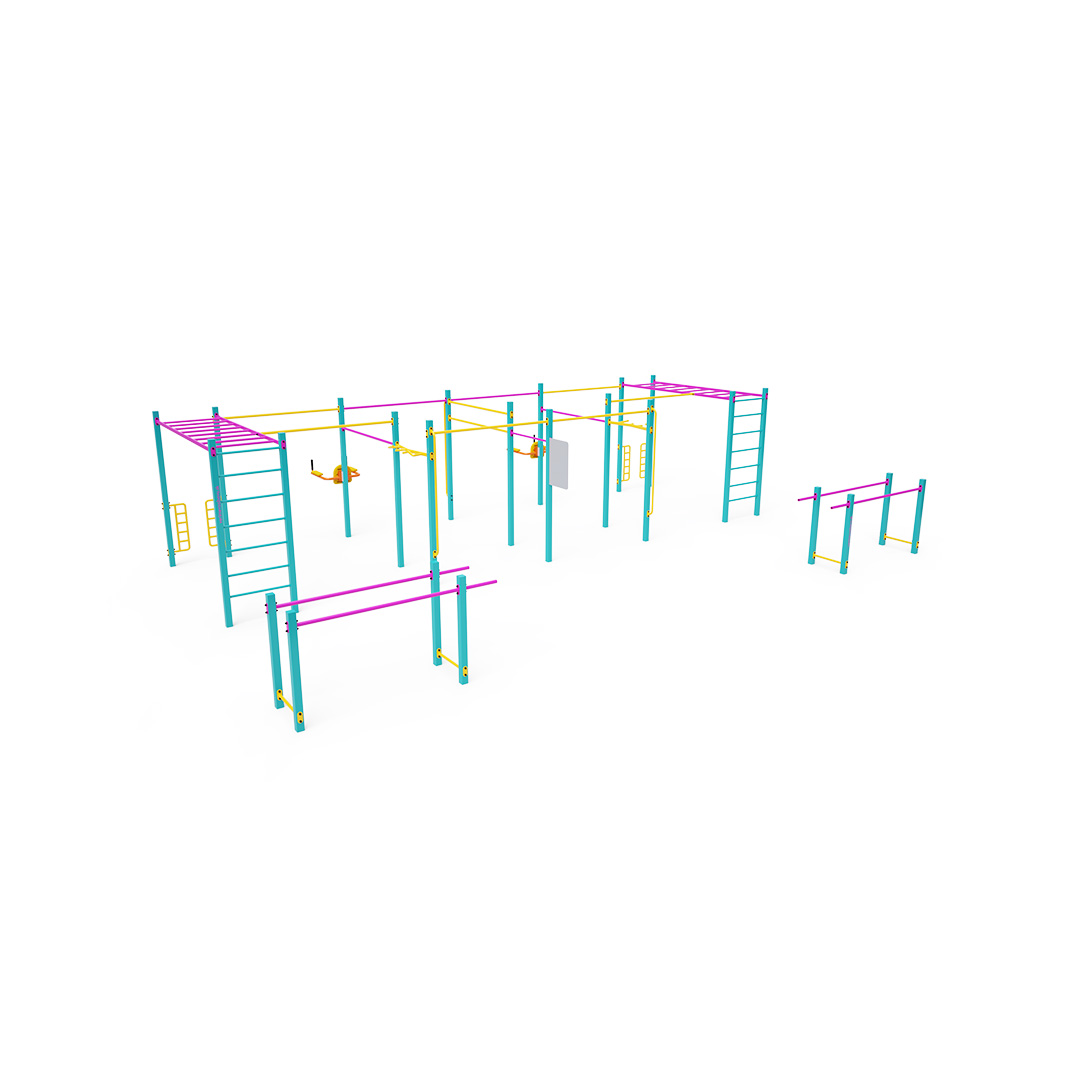 A több különböző magasságú korláttal, létrával és bordás létrával ellátott közepes méretű összeállítást két hasizomerősítő és szabadon álló rudak egészíti ki.