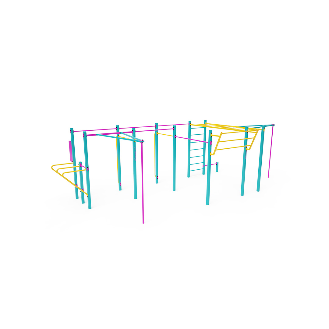 A testedzés egyre népszerűbb szabadtéri testmozgási forma, amely elsősorban a testsúlyt használja. Az edzőeszközök és -beállítások által lehetővé tett gyakorlatok sokfélesége, a friss levegő környezetével kombinálva változatossá és lebilincselővé teszi a tevékenységet. Ez nemcsak a fizikai egészségre jótékony hatással van, hanem a mentális jóléthez is hozzájárul. Ez a közepes méretű készlet több különböző magasságú vízszintes rudat, két függőleges rudat és egy ferde bordásfalat tartalmaz. Dupla párhuzamos korlát, egy alacsony rúd, valamint vízszintes és függőleges létrák egészítik ki.