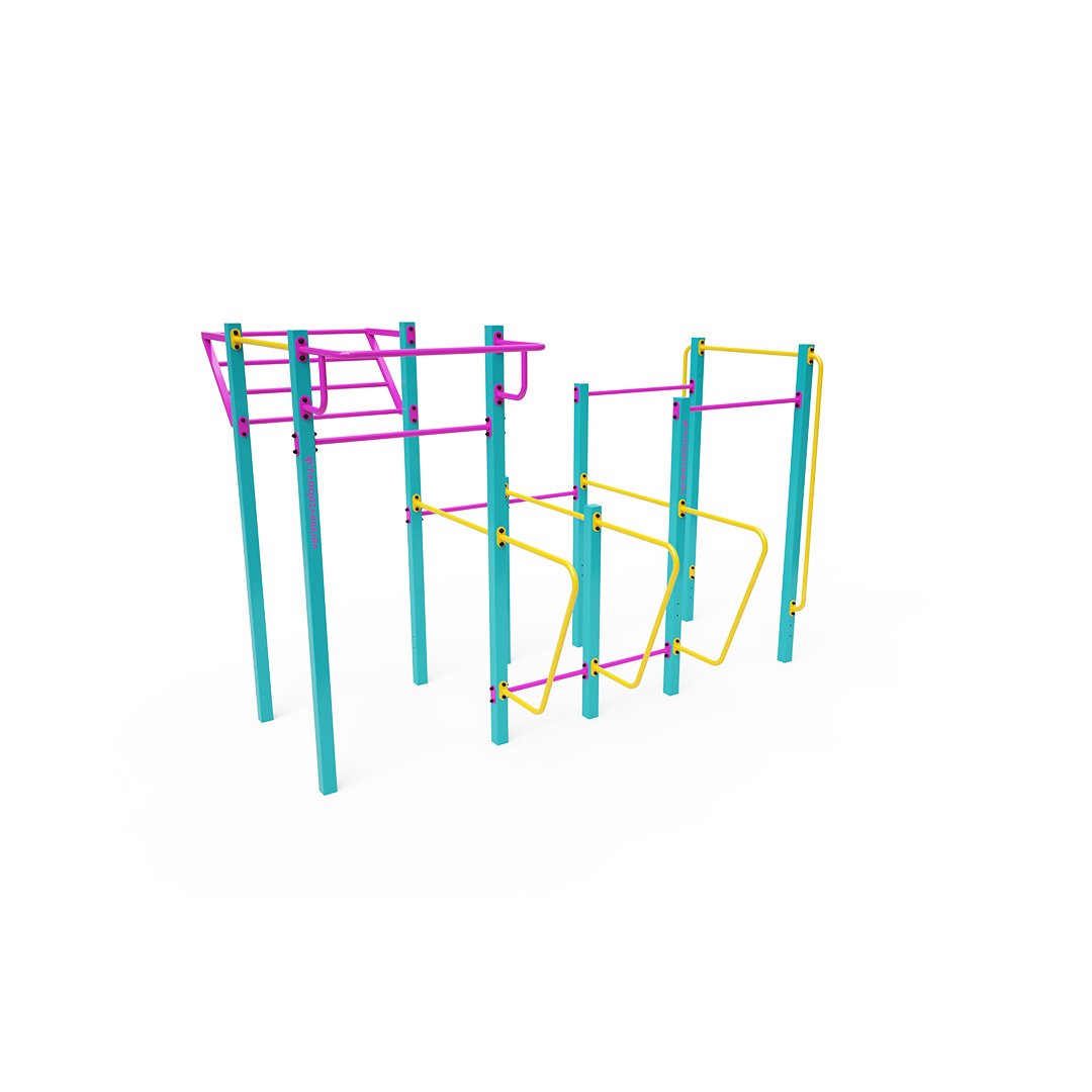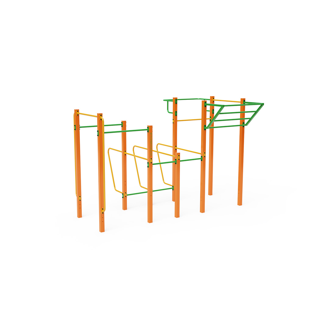 A testedzés egyre népszerűbb szabadtéri testmozgási forma, amely elsősorban a testsúlyt használja. Az edzőeszközök és -beállítások által lehetővé tett gyakorlatok sokfélesége, a friss levegő környezetével kombinálva változatossá és lebilincselővé teszi a tevékenységet. Ez nemcsak a fizikai egészségre jótékony hatással van, hanem a mentális jóléthez is hozzájárul. Ez a közepes méretű készlet több különböző magasságú vízszintes rudat, függőleges rudakat és egy ferde bordásfalat tartalmaz. Két pár dupla párhuzamos korlát és egy kiálló rúd egészíti ki.