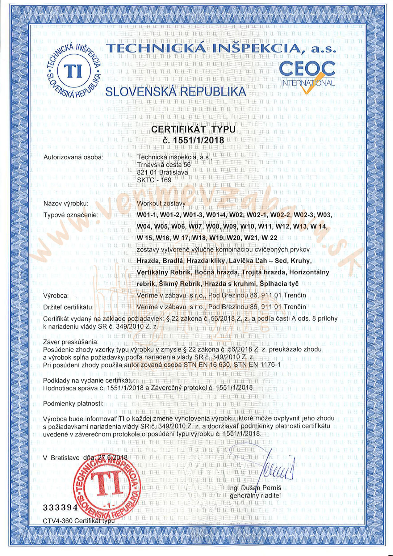 A W16-2 Street workout összeállítás a Szlovák Köztársaság STN EN 16 630 szabványa szerint tanúsított.