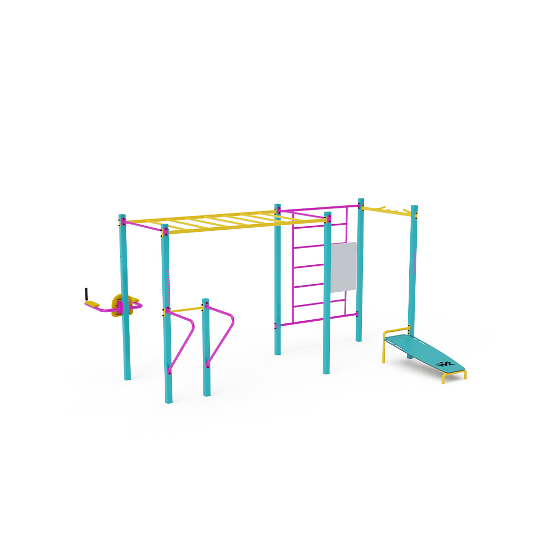 Kisebb összeállítás korláttal, vízszintes és függőleges létrával, rudakkal, erősítő fekvőpaddal és hasizomerősítővel.