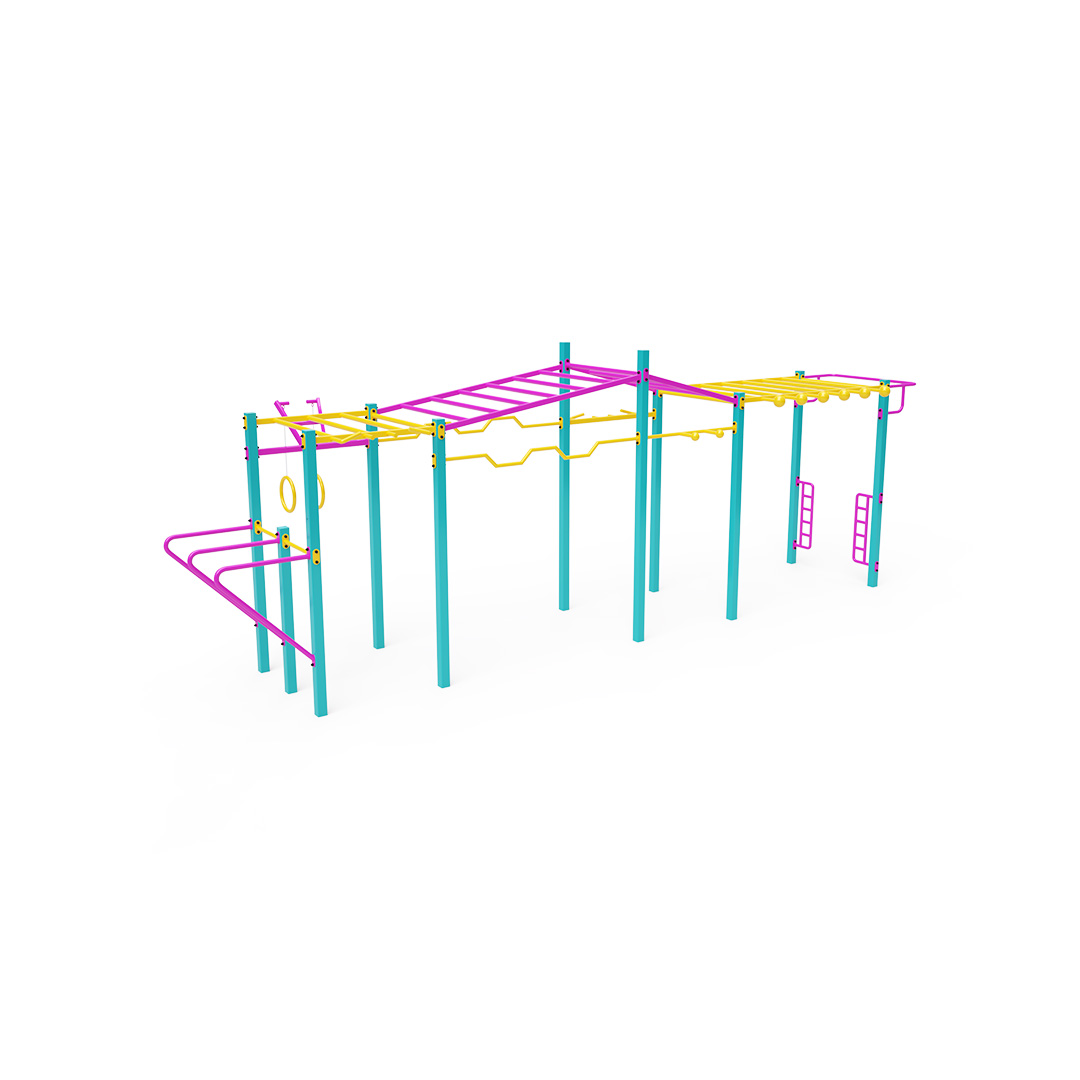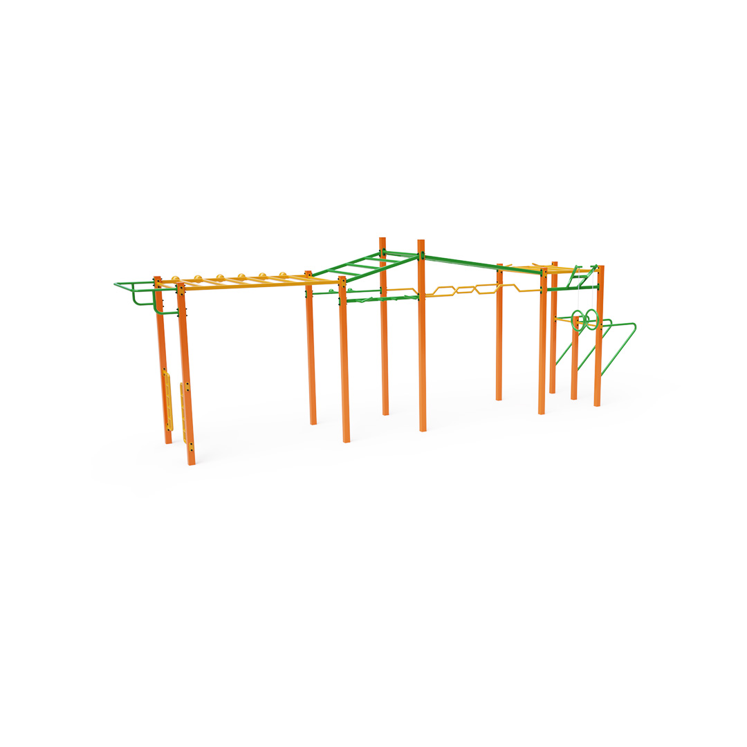 A szabadtéri edzés egyre népszerűbb formája, amely elsősorban a saját testsúlyt használja. A testmozgás változatos a friss levegőnek és a gyakorlatok széles skálájának köszönhetően, amelyet az edzéselemek és a beállítások lehetővé tesznek. Nemcsak a fizikai, hanem a mentális jólétre is jótékony hatással van. Nagyméretű összeállítás különböző konfigurációjú vízszintes rudakkal, párhuzamos korlátokkal és vízszintes létrákkal, kiegészítve gyűrűkkel és egy függőleges létrával fekvőtámaszhoz.