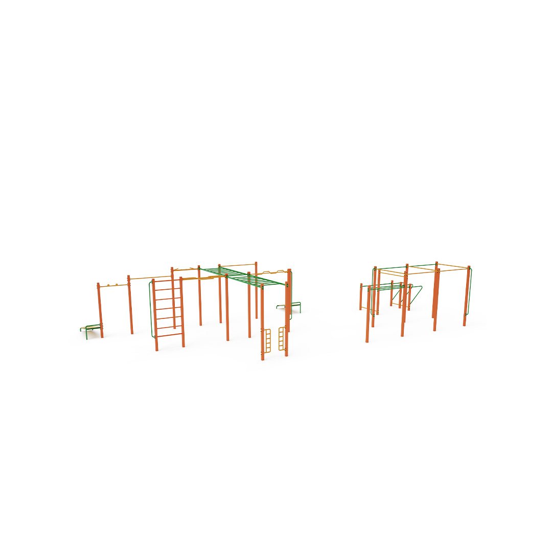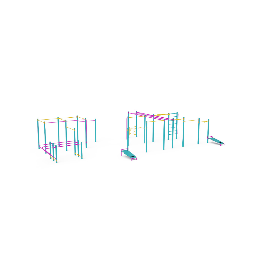 Az utcai edzés egyre népszerűbb módja a szabadtéri testmozgásnak, elsősorban a saját testsúly felhasználásával. A testmozgás változatos a friss levegőnek és a gyakorlatok széles skálájának köszönhetően, amelyeket az edzéselemek és a beállítások lehetővé tesznek. Nemcsak a fizikai, hanem a mentális jólétre is jótékony hatással van. A nagyméretű beállítás különböző magasságú vízszintes rudakat, függőleges rudakat, támlájú rudakat, valamint vízszintes és függőleges létrákat tartalmaz. Egy félkör alakú rúd és két felüléspad egészíti ki.